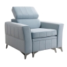 Fotel oferuje możliwość wyboru rodzaju stopek, co umożliwia dopasowanie go do charakteru wnętrza. Dostępne są metalowe stopki w chromie lub w kolorze czarnym, a także drewniane w odcieniach czarnym, białym, olcha, venge oraz buk. Dzięki temu mebel może harmonijnie współgrać zarówno z nowoczesnymi, jak i bardziej klasycznymi aranżacjami.