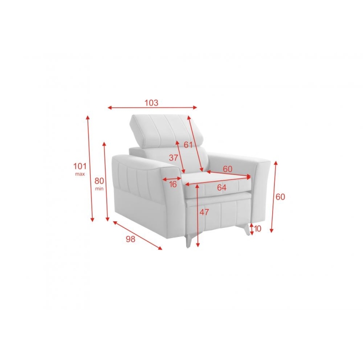 Szerokie siedzisko o wymiarze 64 cm gwarantuje swobodę ruchu oraz stabilne podparcie. Całkowita szerokość fotela wynosi 103 cm, co nadaje mu wyrazistą i masywną formę. Głębokość na poziomie 98 cm pozwala na komfortowe oparcie pleców i nóg.
