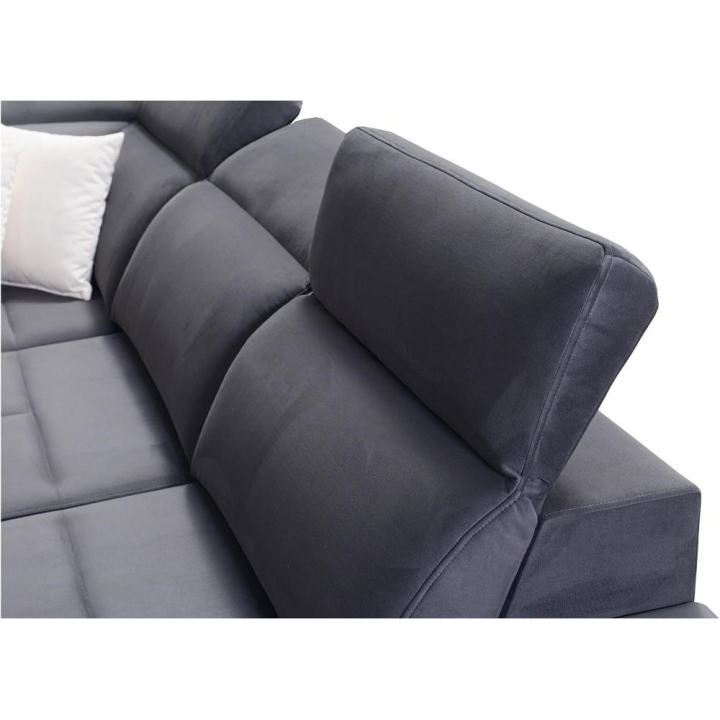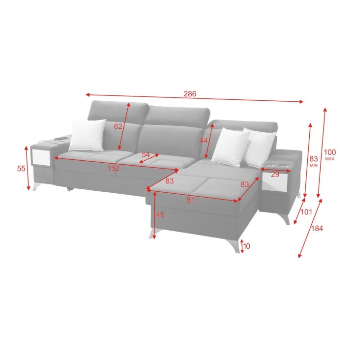 Konstrukcja osiąga szerokość 286 cm oraz głębokość 184 cm, co zapewnia obszerną strefę siedzenia. Wysokość siedziska 45 cm sprzyja wygodnej pozycji, a maksymalna wysokość narożnika 100 cm podkreśla solidny charakter formy. Mebel sprawdzi się zarówno w salonie, jak i w strefach dziennych o większym metrażu.