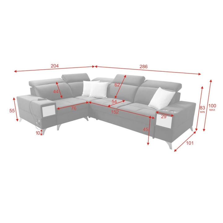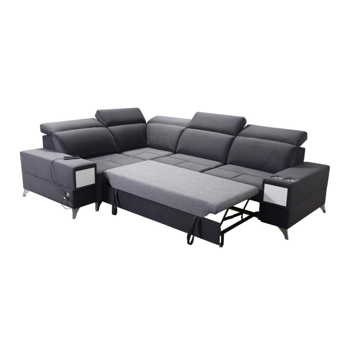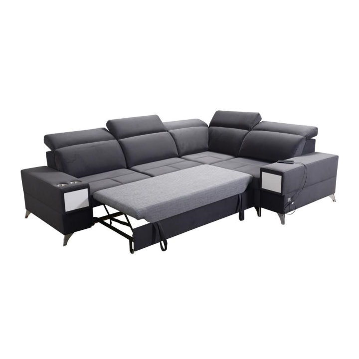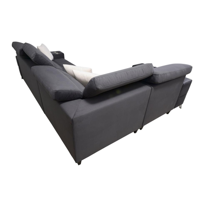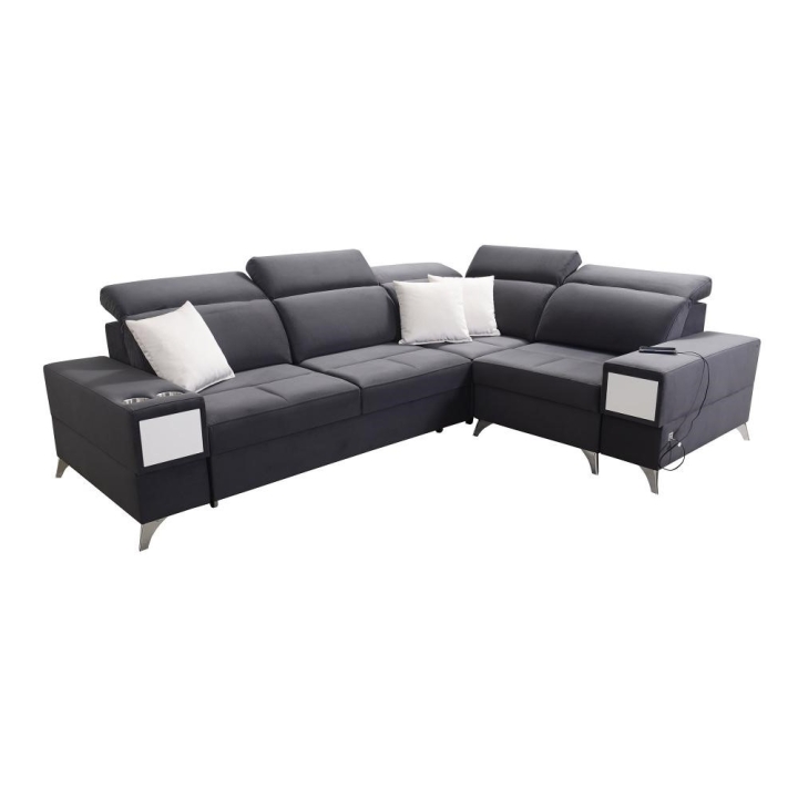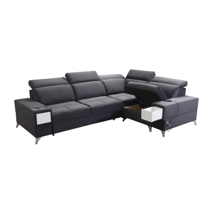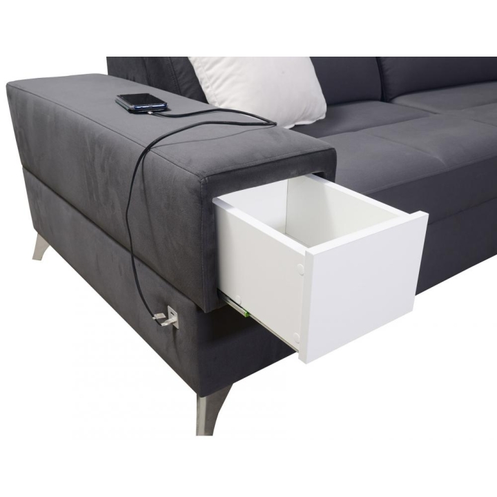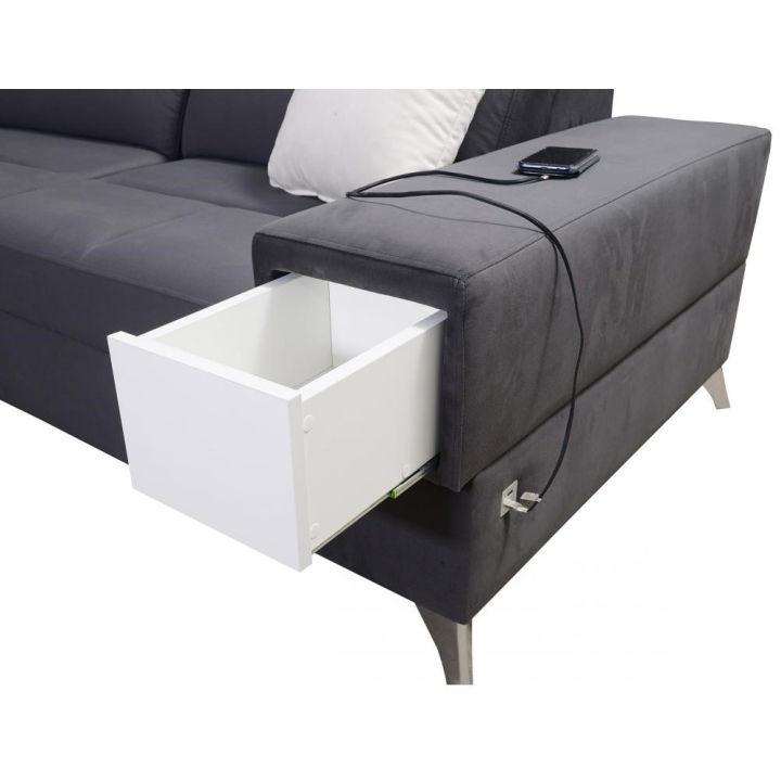 W części bocznej przewidziano wysuwaną szufladkę, zwiększającą możliwości przechowywania drobnych przedmiotów. Narożnik posiada gniazdo USB dostępne w kolorze czarnym lub srebrnym, a także kubki w kolorze czarnym lub srebrnym. Poduszki widoczne na zdjęciu stanowią integralny element zestawu.