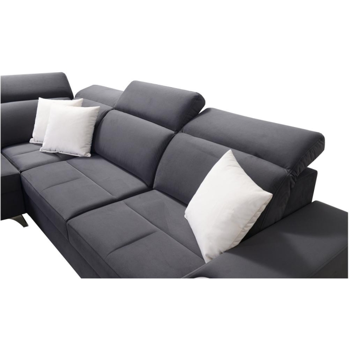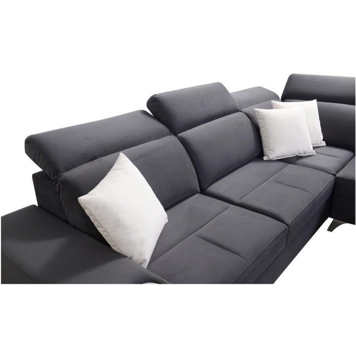 Konstrukcja narożnika opiera się na solidnych materiałach, zapewniających stabilność podczas codziennego użytkowania. Model wyposażono w 5 regulowane zagłówki, umożliwiające indywidualne dopasowanie podparcia głowy. Wysokość siedziska wynosi 45 cm, natomiast maksymalna wysokość narożnika to 100 cm.
