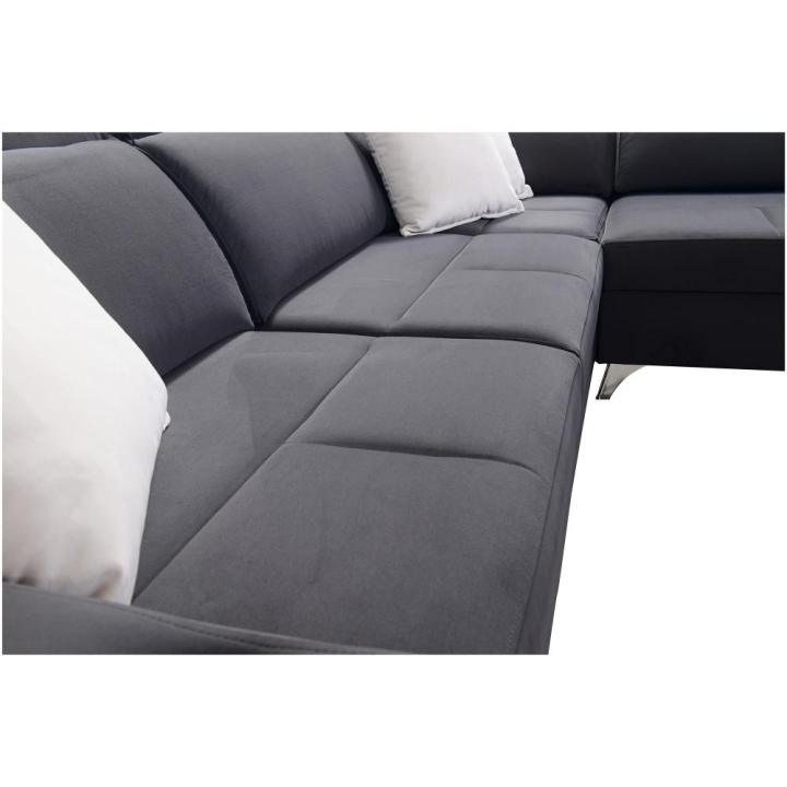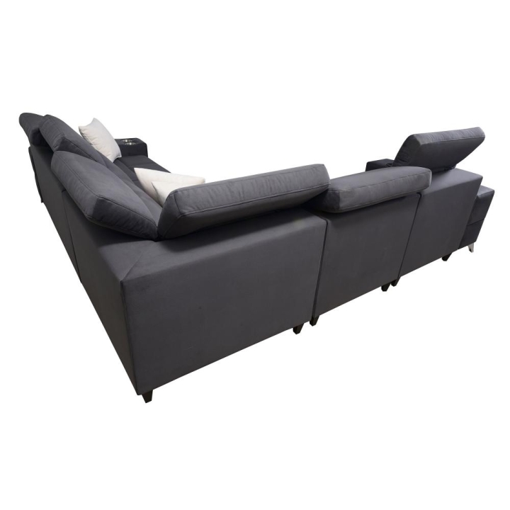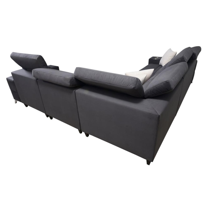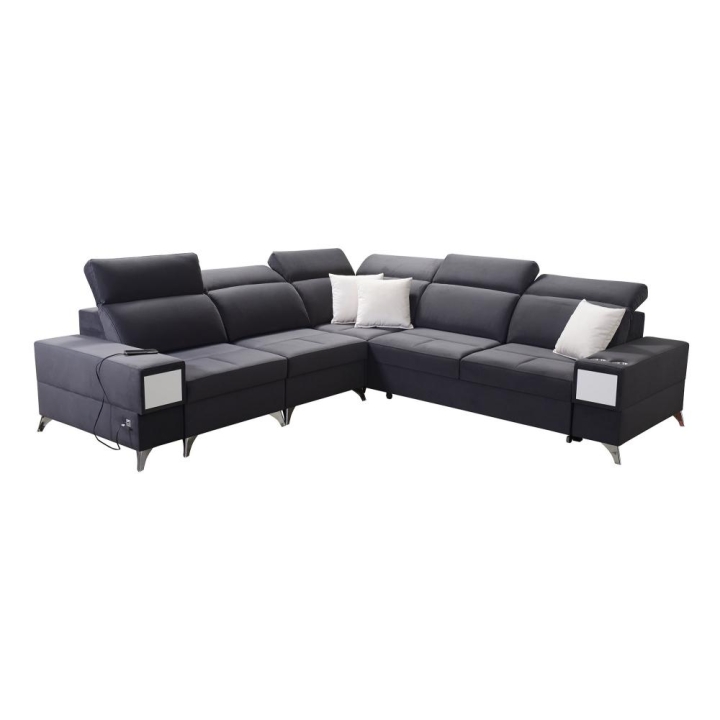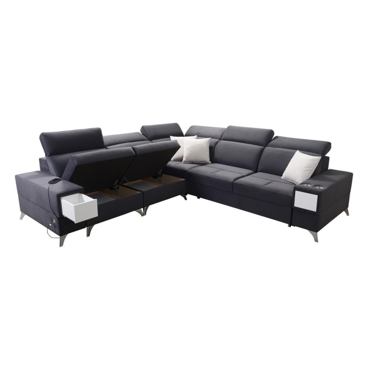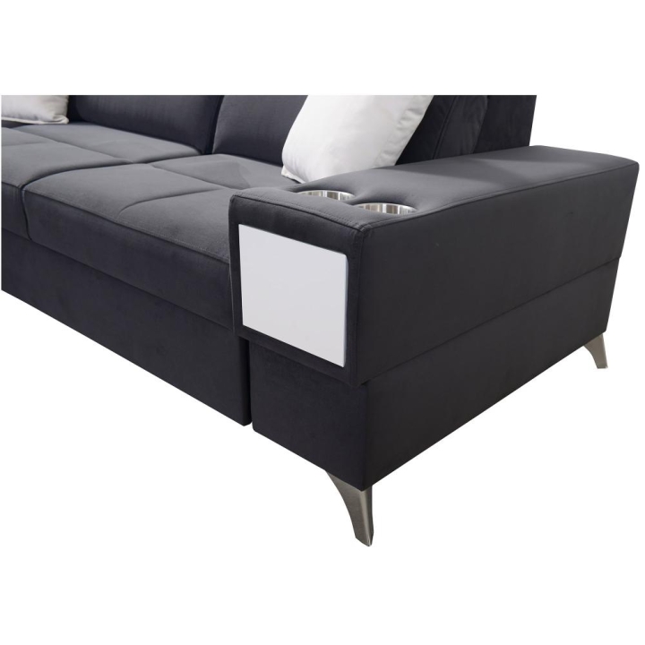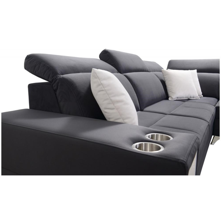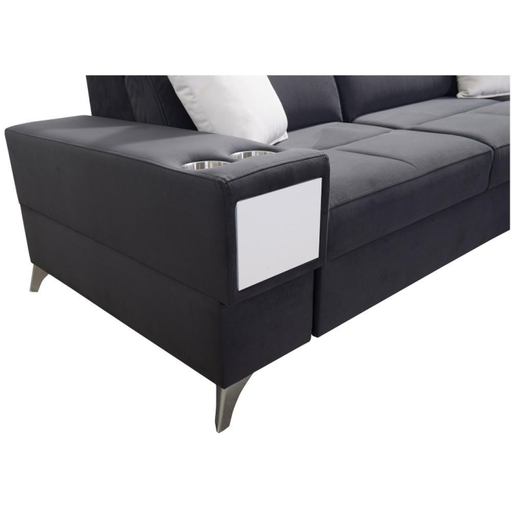 Narożnik posiada port USB dostępny w kolorze czarnym lub srebrnym, co umożliwia podłączenie urządzeń elektronicznych. Wbudowane kubki w kolorze czarnym lub srebrnym podnoszą wygodę użytkowania strefy wypoczynku. Detale te zostały dyskretnie zintegrowane z konstrukcją mebla.