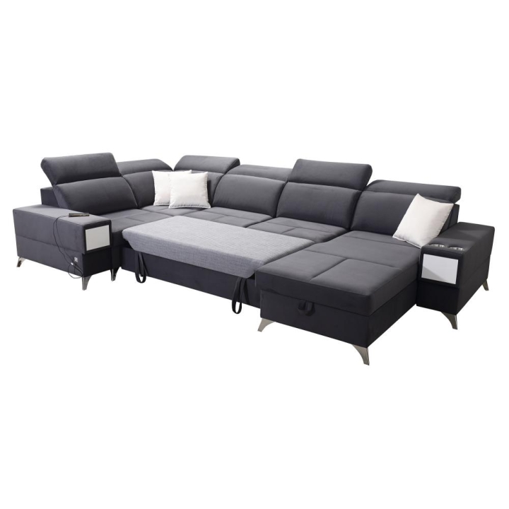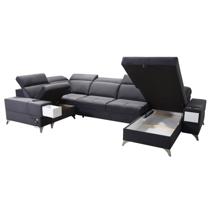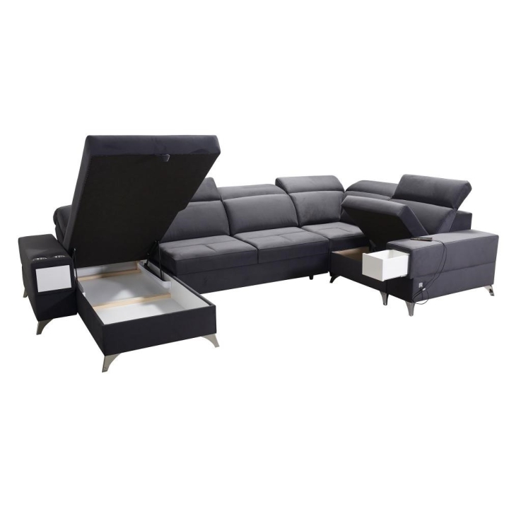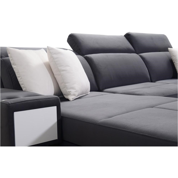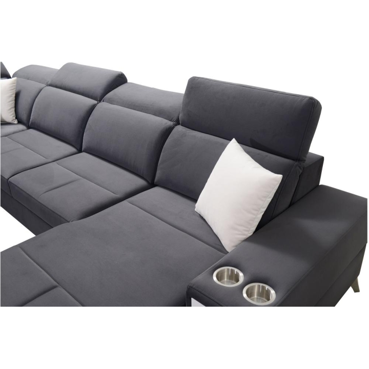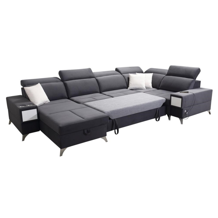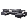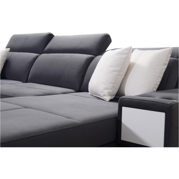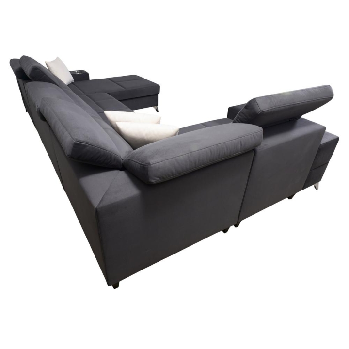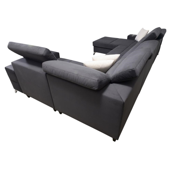 Istotnym elementem są 6 regulowanych zagłówków, które pozwalają na indywidualne dopasowanie pozycji oparcia. W bryle umieszczono także 2 pojemniki na pościel, ułatwiające przechowywanie tekstyliów bez potrzeby stosowania dodatkowych mebli. Widoczne na zdjęciach poduszki dekoracyjne stanowią integralną część zestawu.