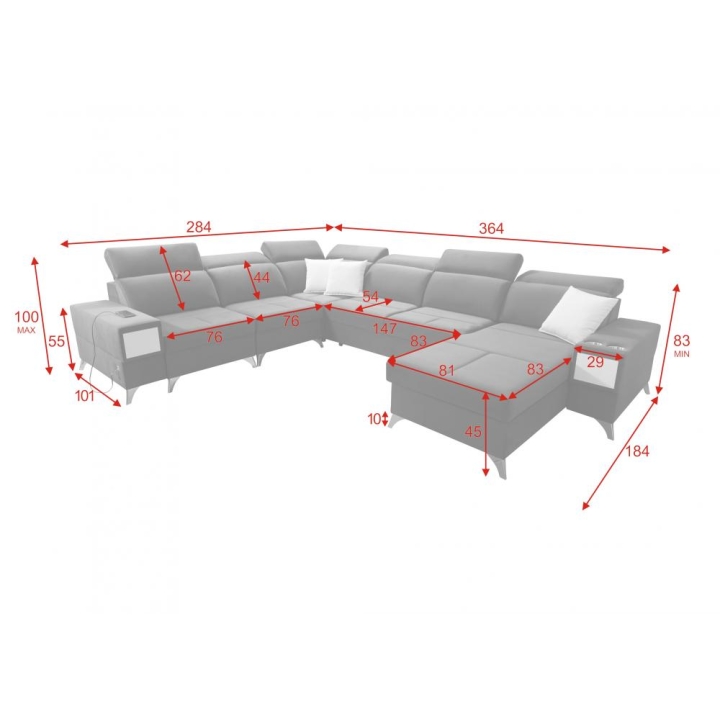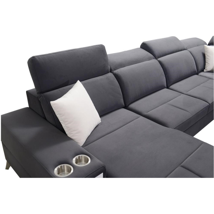Model wyposażono w 7 regulowanych zagłówków, umożliwiających indywidualne dopasowanie pozycji oparcia głowy i karku. Wysokość siedziska 45 cm sprzyja wygodnemu wstawaniu, natomiast maksymalna wysokość narożnika 100 cm podkreśla solidną konstrukcję mebla. Widoczne na zdjęciach poduszki dekoracyjne stanowią integralny element zestawu.