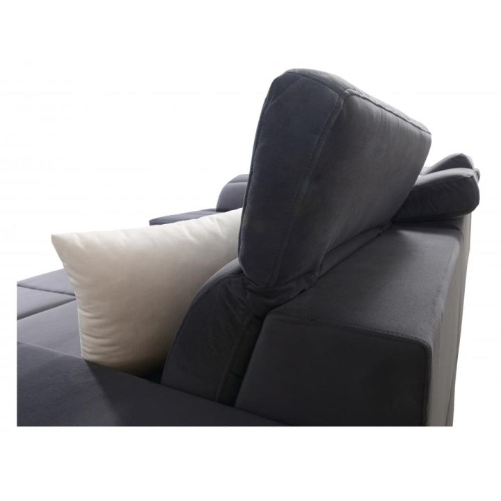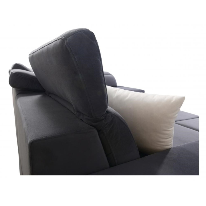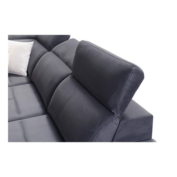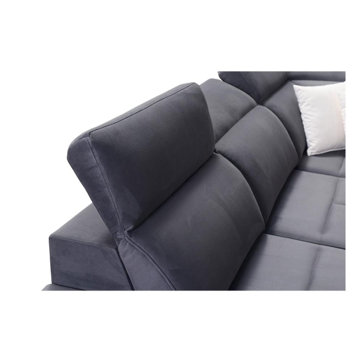 Model wyposażono w 7 regulowanych zagłówków, które umożliwiają indywidualne dopasowanie podparcia głowy i karku. Wysokość siedziska 45 cm sprzyja komfortowemu wstawaniu, a maksymalna wysokość narożnika 100 cm zapewnia solidne podparcie pleców. Całość uzupełniają poduszki widoczne na zdjęciu, podnoszące jakość codziennego wypoczynku.