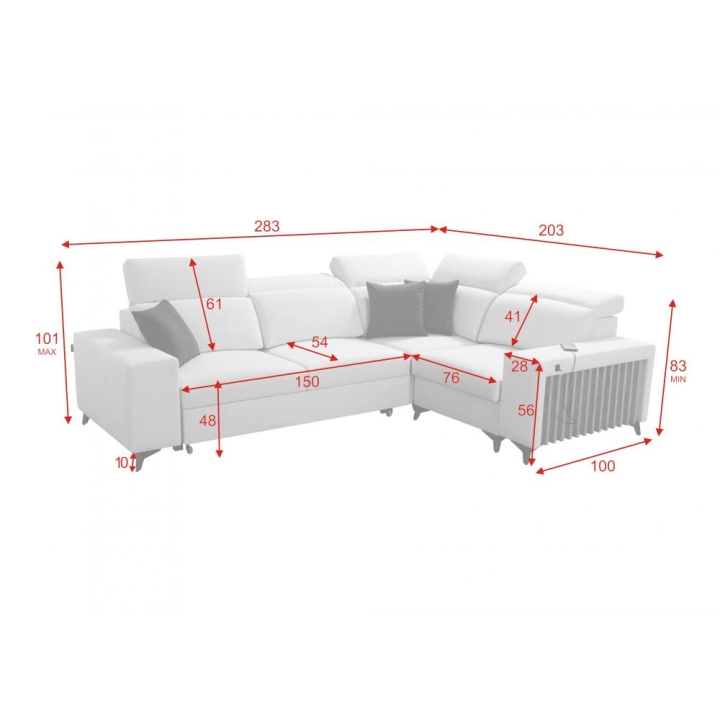 Model wyposażono w 5 regulowanych zagłówków, umożliwiających indywidualne dopasowanie podparcia głowy i karku. Wysokość siedziska na poziomie 48 cm sprzyja wygodnemu wstawaniu, natomiast maksymalna wysokość narożnika 101 cm zapewnia stabilne oparcie dla pleców. W zestawie znajdują się także poduszki widoczne na zdjęciu – gratis, uzupełniające formę mebla.