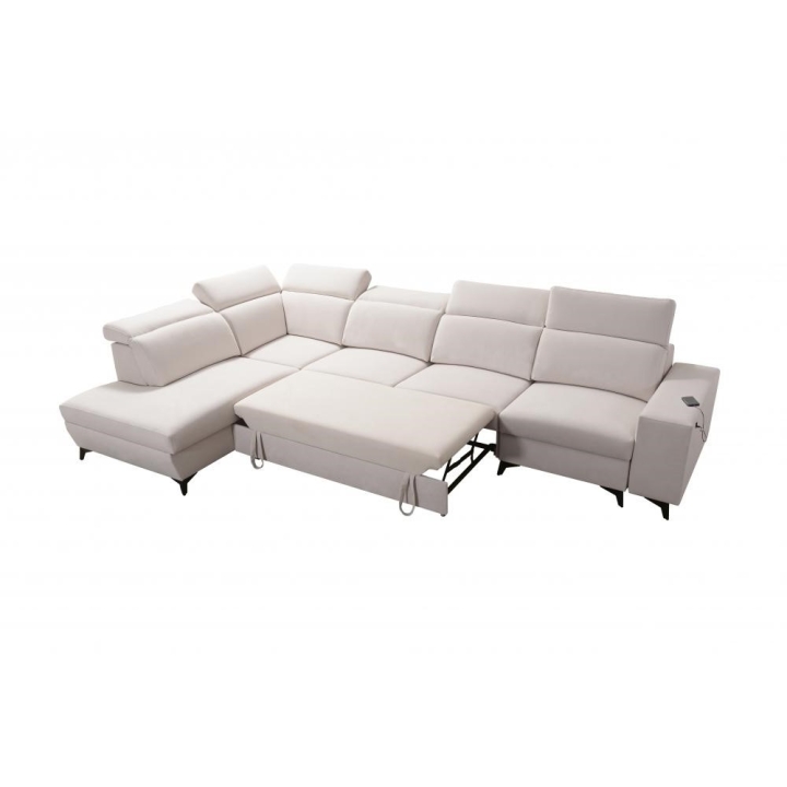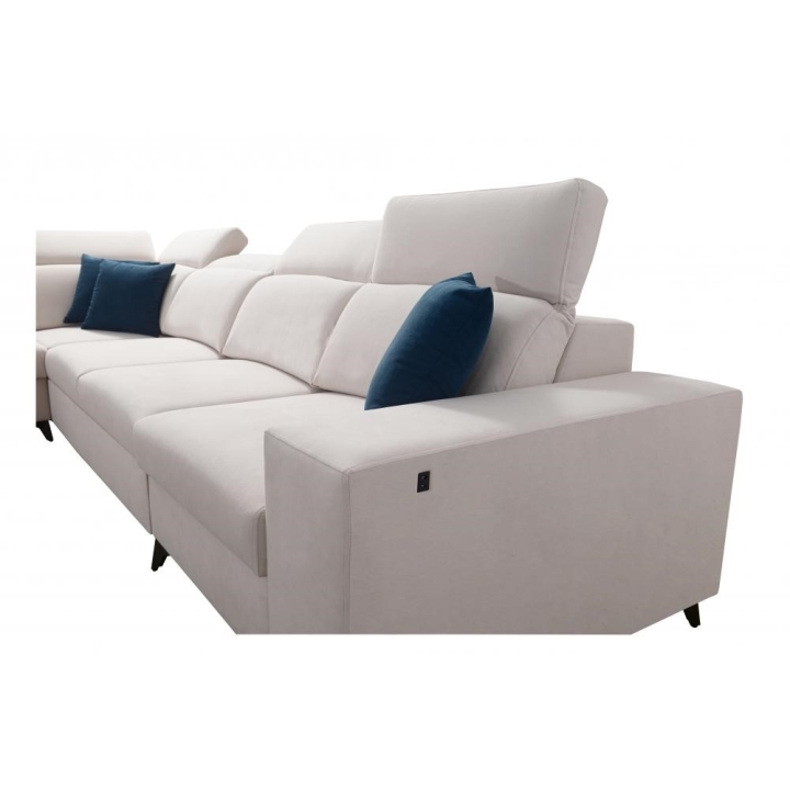 Dodatkową wygodę zapewnia port USB dostępny w kolorze czarnym lub srebrnym, umożliwiający ładowanie urządzeń bez wstawania z kanapy. Klient ma możliwość wyboru stopek przednich: metal chrom, metal czarny mat lub metal złote, a także stopek tylnych: drewniane w kolorze czarnym, białym, olcha, venge, buk lub chrom za dopłatą. Maksymalna wysokość narożnika 101 cm sprawia, że mebel prezentuje się masywnie i stabilnie.
