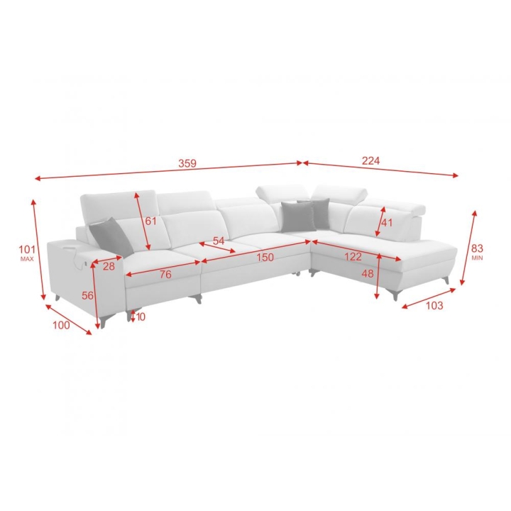 Model wyposażono w 6 regulowanych zagłówków, które umożliwiają indywidualne dopasowanie podparcia głowy i karku. Dzięki temu narożnik sprawdza się zarówno podczas siedzenia, jak i półleżącej pozycji. Wysokość siedziska 48 cm ułatwia wstawanie i zapewnia wygodne ułożenie nóg.