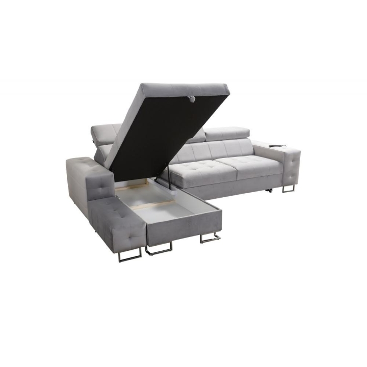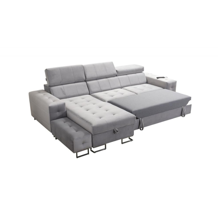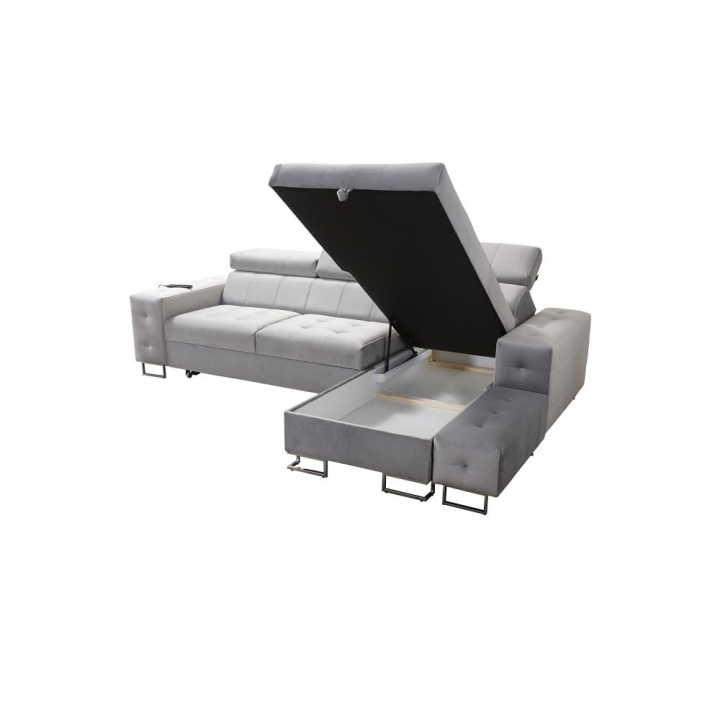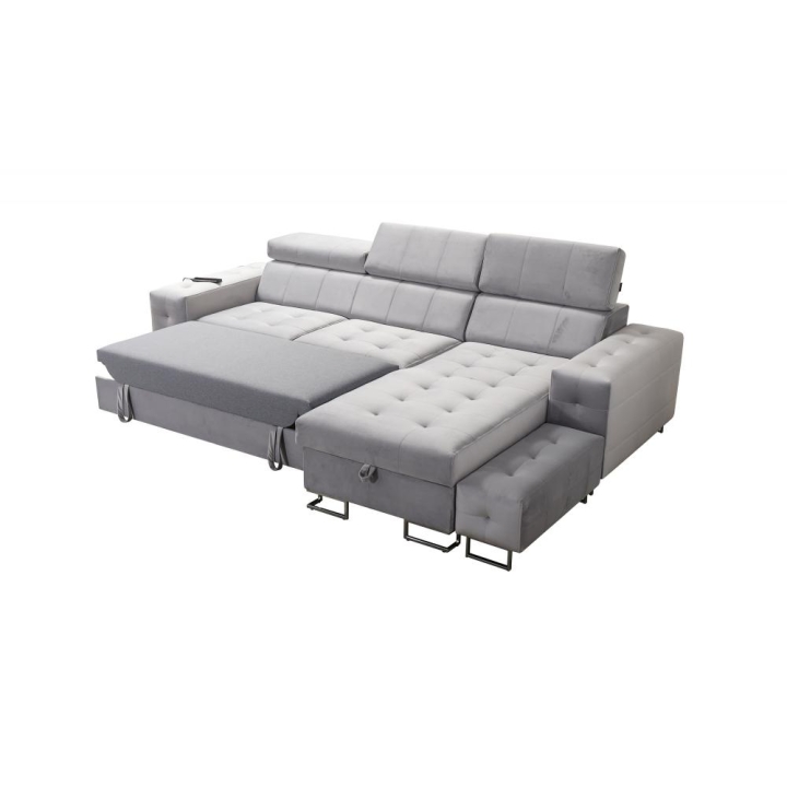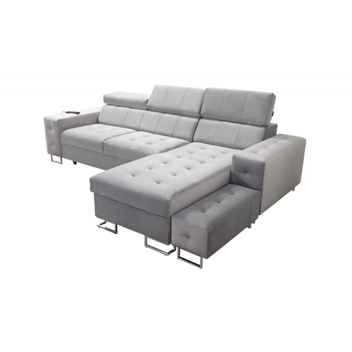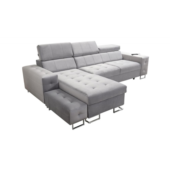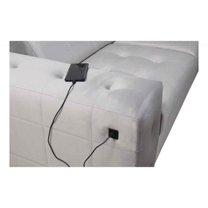 Na szczególną uwagę zasługuje ruchoma dostawka, która zwiększa możliwości aranżacyjne i pozwala dostosować układ do aktualnych potrzeb. W bocznym panelu dostępne jest gniazdo USB w kolorze czarnym lub srebrnym, umożliwiające ładowanie urządzeń mobilnych bez wstawania z miejsca. Poduszki widoczne na zdjęciu dołączone są gratis, podnosząc komfort użytkowania od pierwszego dnia.