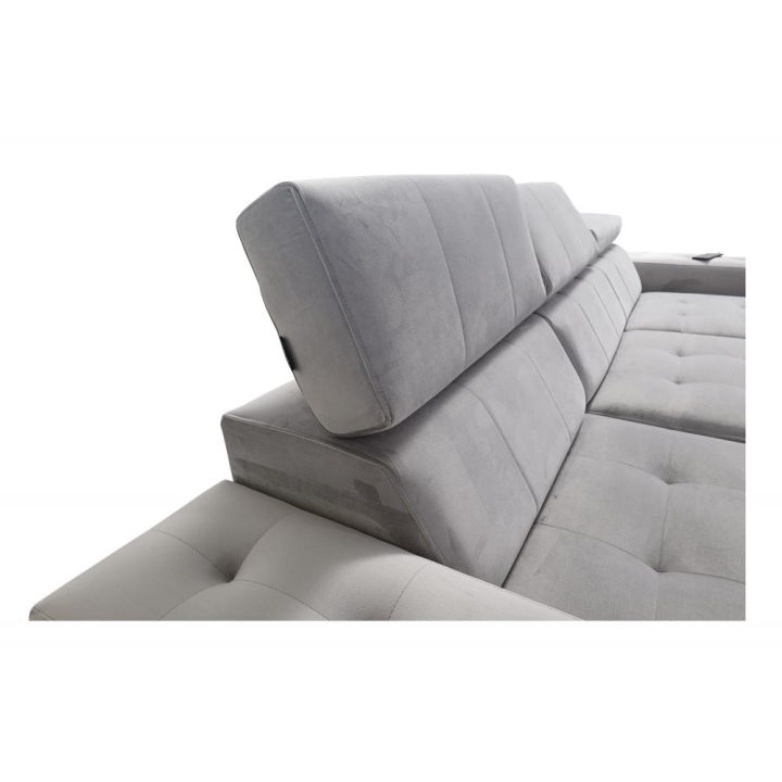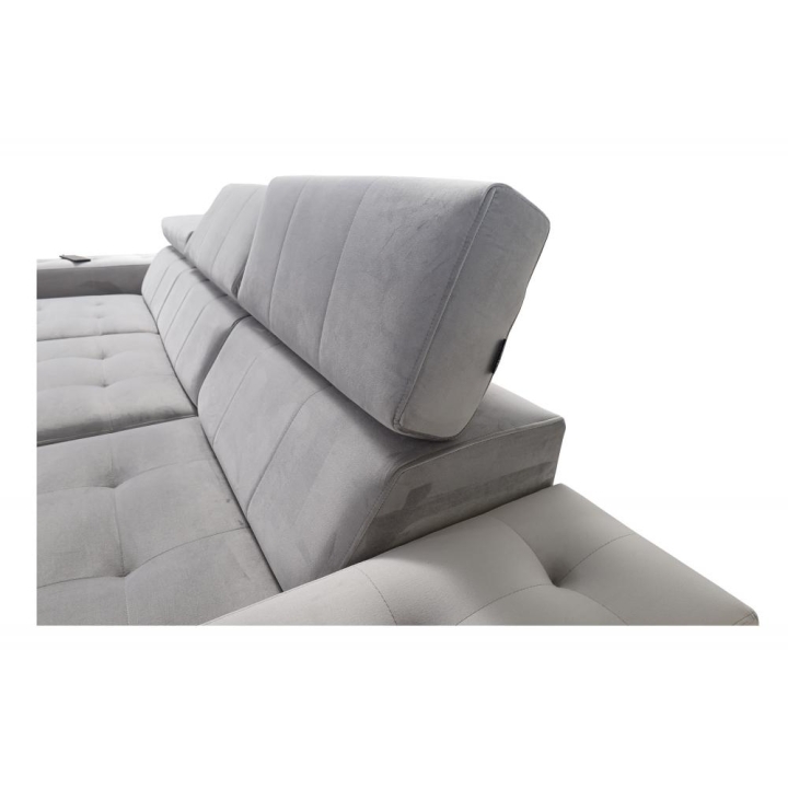 Model wyposażono w 3 regulowane zagłówki, które umożliwiają indywidualne dopasowanie pozycji oparcia głowy podczas wypoczynku. Wysokość siedziska 46 cm sprzyja komfortowemu wstawaniu i siadaniu, a maksymalna wysokość narożnika 100 cm nadaje bryle wyraźnej, solidnej formy. Dzięki starannemu wykończeniu mebel prezentuje się reprezentacyjnie w strefie dziennej.