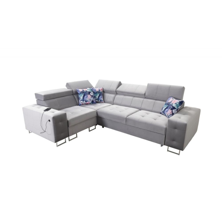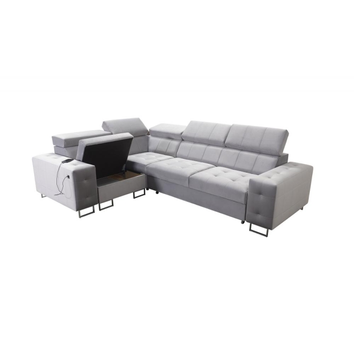 W rogu mebla umieszczono półkę, idealną na książkę, pilot lub telefon, a dodatkowym udogodnieniem jest port USB dostępny w kolorze czarnym lub srebrnym. W zestawie znajdują się także poduszki widoczne na zdjęciu – gratis, które wzbogacają wygląd i zwiększają komfort użytkowania. Uzupełnieniem bryły jest ruchoma dostawka, pozwalająca elastycznie zmieniać układ siedzisk.