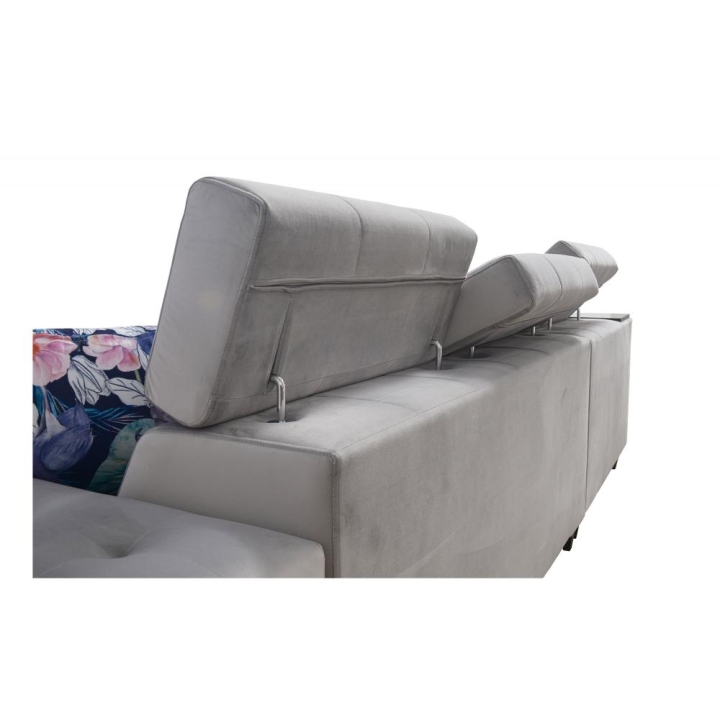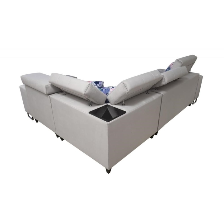 Model wyposażono w 5 regulowanych zagłówków, które pozwalają dostosować podparcie głowy i karku do indywidualnych preferencji. Siedzisko umieszczone na wysokości 46 cm sprzyja komfortowemu wstawaniu i stabilnej pozycji siedzącej. Całość tworzy spójną formę, która dobrze prezentuje się w centralnej części salonu.
