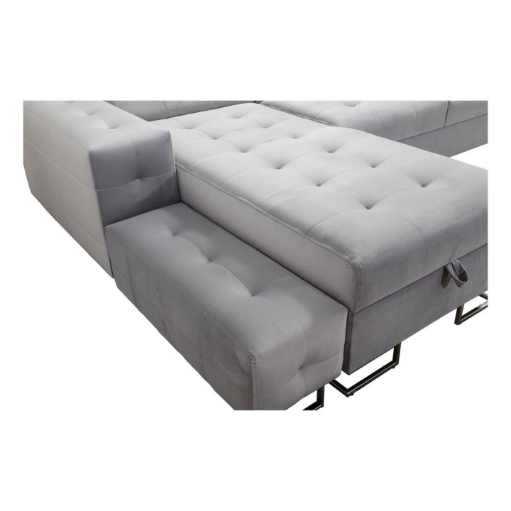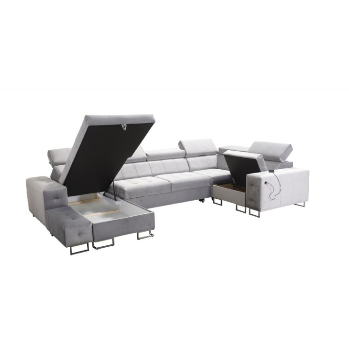 Po rozłożeniu narożnik zapewnia przestronną powierzchnię spania o wymiarach 284 cm x 127 cm, odpowiednią do nocnego wypoczynku dla dwóch osób. Do dyspozycji użytkownika pozostają 2 pojemniki na pościel, które ułatwiają przechowywanie kołder i poduszek. W zestawie znajdują się także poduszki widoczne na zdjęciu – gratis oraz ruchoma dostawka, zwiększająca powierzchnię użytkową.