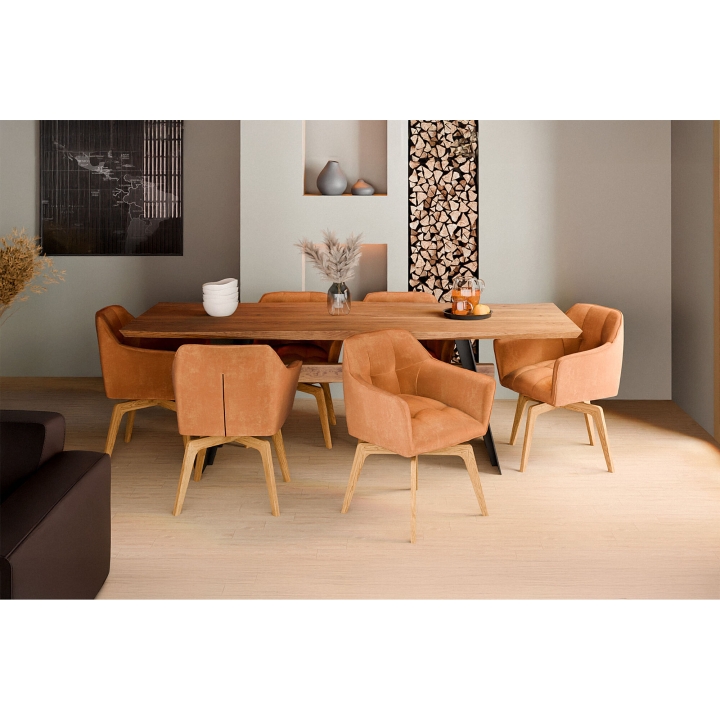 Wymiary całkowite to szerokość 62 cm, wysokość 83 cm i głębokość 61 cm, co czyni model odpowiednim zarówno do jadalni, jak i domowego gabinetu. Zwarta forma ułatwia ustawienie kilku egzemplarzy przy większym stole, nie ograniczając swobody poruszania się. Obrotowa konstrukcja podstawy sprzyja wygodzie w trakcie spotkań przy stole lub pracy przy biurku.