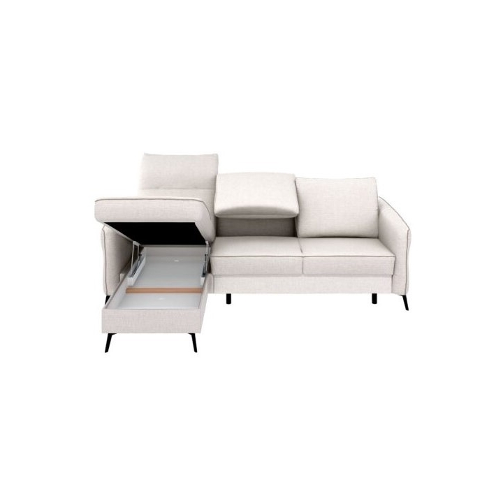 Konstrukcja narożnika została oparta na sprężynach falistych typu B oraz piance poliuretanowej, co gwarantuje odpowiednie podparcie i trwałość siedziska. Oparcie wykonano z użyciem pasów elastycznych oraz wypełnienia z mieszanki pianki i włókna, dzięki czemu zapewnia ono miękkość i wygodę podczas wypoczynku. Wysokie, metalowe nogi o wysokości 13 cm nadają całości lekkości i ułatwiają utrzymanie czystości pod meblem.