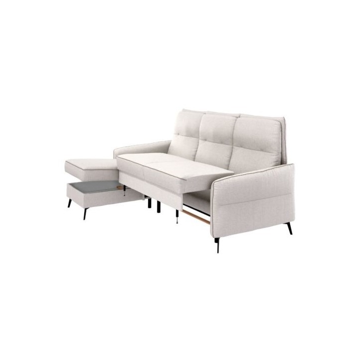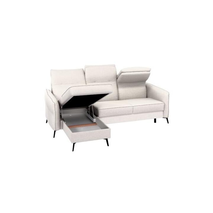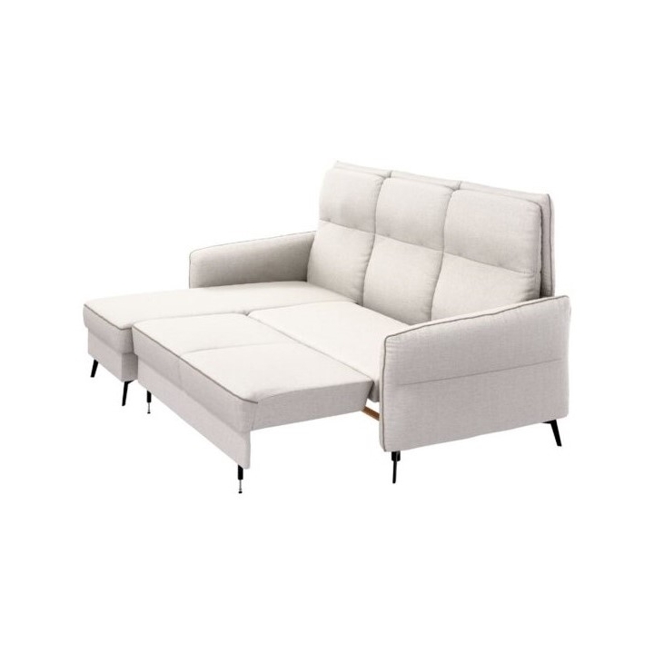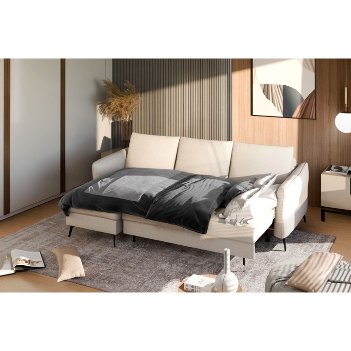 Narożnik posiada również funkcję spania typu Leopard, która pozwala w prosty sposób przekształcić go w powierzchnię do nocnego wypoczynku o wymiarach 130x200 cm. Dodatkowym atutem jest pojemnik na pościel, zapewniający wygodne miejsce do przechowywania koców czy poduszek. To rozwiązanie sprawia, że mebel sprawdza się także w mniejszych mieszkaniach, gdzie liczy się każdy centymetr przestrzeni.
