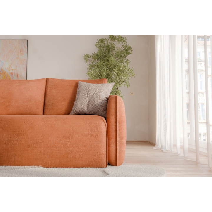 Pod siedziskiem znajduje się pojemnik na pościel o wymiarach 133 × 67 × 19 cm, który umożliwia przechowywanie koców, poduszek lub kołder. Dzięki temu przestrzeń salonu pozostaje uporządkowana, a niezbędne akcesoria są zawsze pod ręką. Pokrycie wykonane z wysokiej jakości tkaniny jest przyjemne w dotyku i łatwe do utrzymania w czystości.