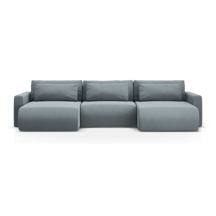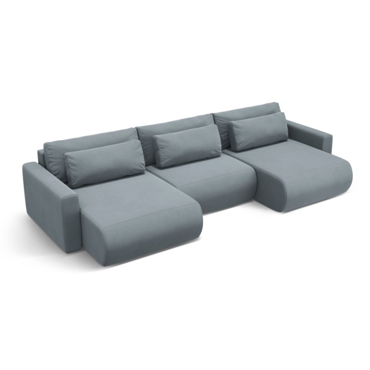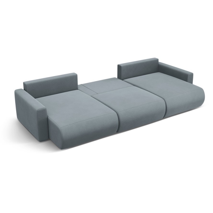 Siedzisko składa się z pianki poliuretanowej o gęstości 30 kg/m³ oraz warstwy waty 200 g/m², wspartych na sprężynach falistych, co zapewnia wygodę i trwałość. Oparcie wypełnione pianką ciętą i silikonem gwarantuje miękkie podparcie pleców. Funkcja spania o powierzchni 300 × 135 cm oferuje komfortowy odpoczynek dla dwóch osób, a pojemnik na pościel umożliwia przechowywanie dodatkowych kołder i poduszek.