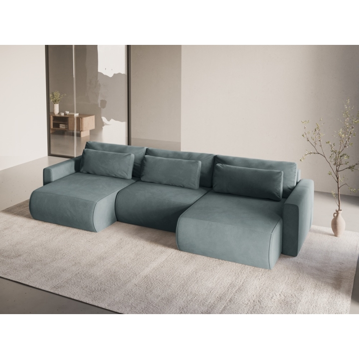 Narożnik 4-os. z funkcją spania i pojemnikiem na pościel Belfast Welur Cosmopolitan-Design to przestronny i wygodny mebel, idealny do dużych wnętrz. Szerokość narożnika wynosi 340 cm, głębokość 149 cm, wysokość 84 cm, szerokość podłokietników 18 cm, a wysokość podłokietników 60 cm. Model w kształcie litery U został wyposażony w dwie szerokie leżanki o głębokości użytkowej 114 cm do 132 cm, po zdjęciu poduszek (głębokość całkowita 149cm każdej leżanki ) które zapewniają dużą powierzchnię do relaksu. Czarne plastikowe nóżki gwarantują stabilność, a tapicerka z tkaniny welurowej dostępna w różnych wariantach kolorystycznych pozwala dopasować narożnik do aranżacji wnętrza.
