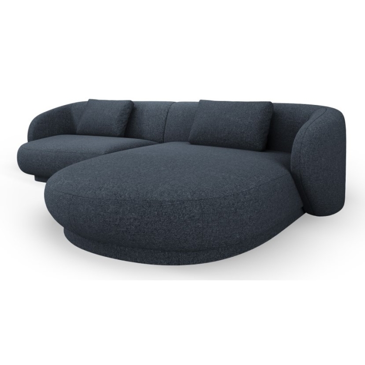 Narożnik 4-osobowy Camden Szenil Cosmopolitan-design to nowoczesny mebel o obłym kształcie, który idealnie pasuje do współczesnych wnętrz salonu. Szerokość narożnika wynosi 289 cm, głębokość dłuższego boku 177 cm, krótszego boku 102 cm, a wysokość 72 cm. Wysokość siedziska to 39 cm, co zapewnia wygodną pozycję siedzącą. Model nie posiada funkcji spania ani pojemnika na pościel. Sofa narożna osadzona jest na niskich, czarnych plastikowych nogach, które podkreślają nowoczesny design.