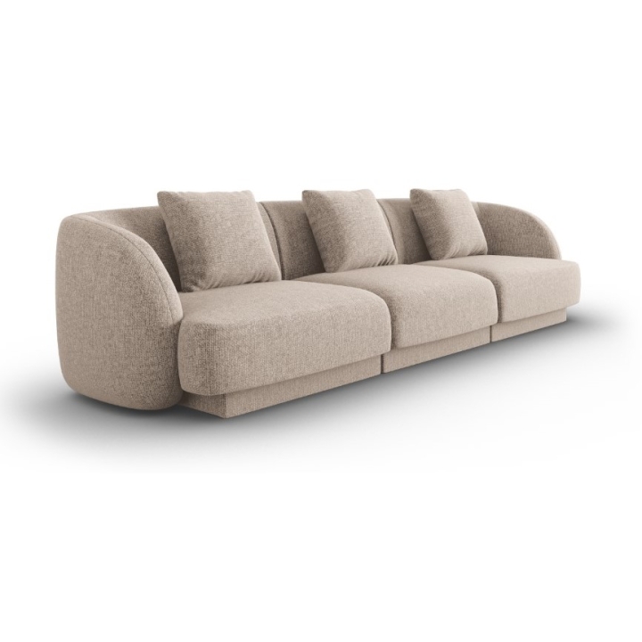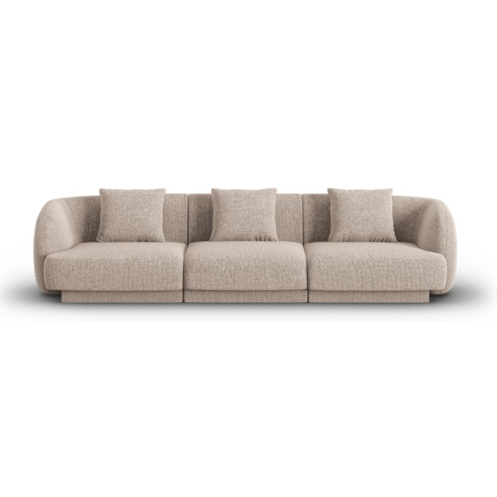 Sofa 3-osobowa Tulum Szenil Cosmopolitan-design to nowoczesny model o obłym kształcie, który doskonale pasuje do stylowych i designerskich wnętrz. Szerokość 255 cm, głębokość 90 cm, wysokość 70 cm oraz wysokość siedziska 40 cm i jego głębokości 65cm zapewniają komfortowy wypoczynek. Tapicerka z tkaniny szenilowej Haga, dostępnej w szerokiej gamie kolorystycznej, wyróżnia się subtelnym efektem 3D i delikatnym połyskiem. W zestawie znajdują się trzy poduszki dekoracyjne, które podkreślają estetykę mebla. Niskie czarne plastikowe nogi, niemal niewidoczne, dodają sofie lekkości i podkreślają jej nowoczesny design.