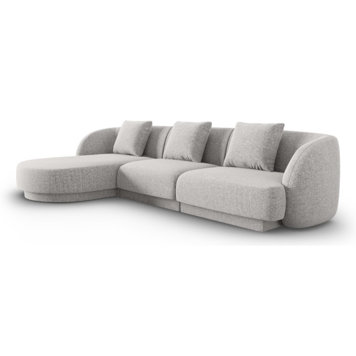 Narożnik 4-os. Tulum Szenil Cosmopolitan-design to nowoczesny model o zaokrąglonych kształtach, który doskonale wpisuje się w minimalistyczne i designerskie wnętrza. Szerokość 255 cm, głębokość 156 cm, wysokość 70 cm oraz wysokość siedziska 40 cm zapewniają wygodę zarówno podczas codziennego relaksu, jak i spotkań towarzyskich. Obicie z tkaniny szenilowej Haga, dostępnej w szerokiej gamie kolorystycznej, wyróżnia się efektem 3D, subtelnym połyskiem i wysoką odpornością na ścieranie (60 000 cykli Martindale). Niskie plastikowe nogi niemal niewidoczne, podkreślają nowoczesny charakter mebla.