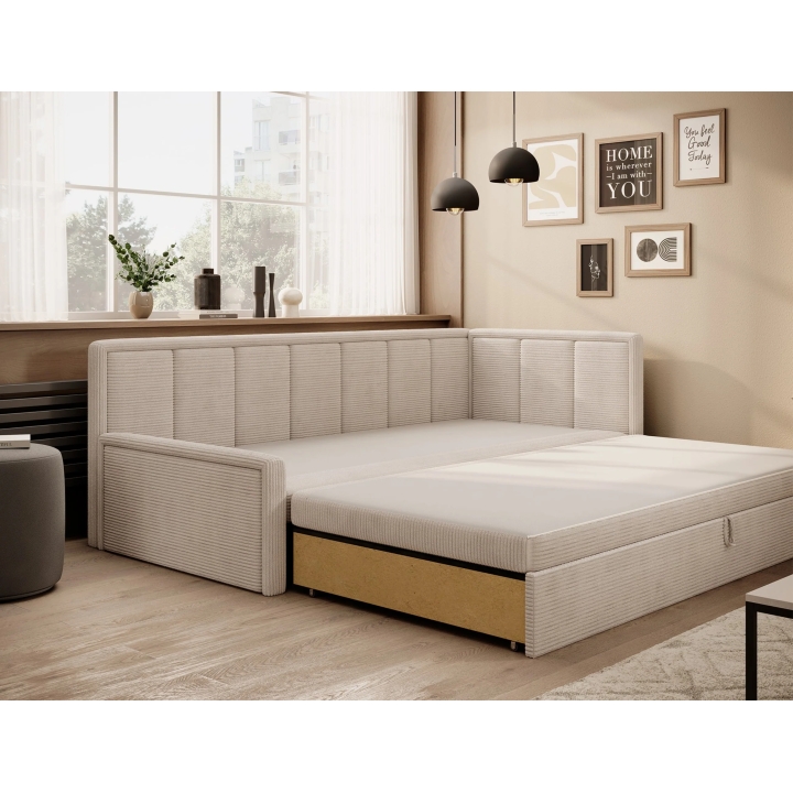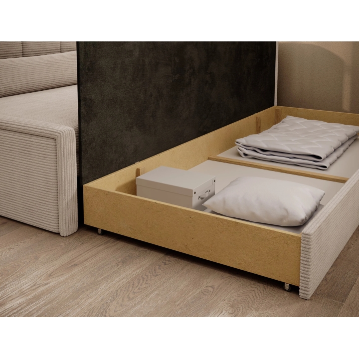 Oprócz funkcji spania sofa skrywa również pojemny schowek na pościel, umieszczony pod siedziskiem. Taka przestrzeń ułatwia przechowywanie kołdry, poduszek czy innych tekstyliów, co pozwala zachować ład w otoczeniu. To praktyczne rozwiązanie może być szczególnie przydatne w pomieszczeniach, w których każdy centymetr miejsca ma znaczenie.