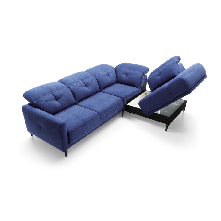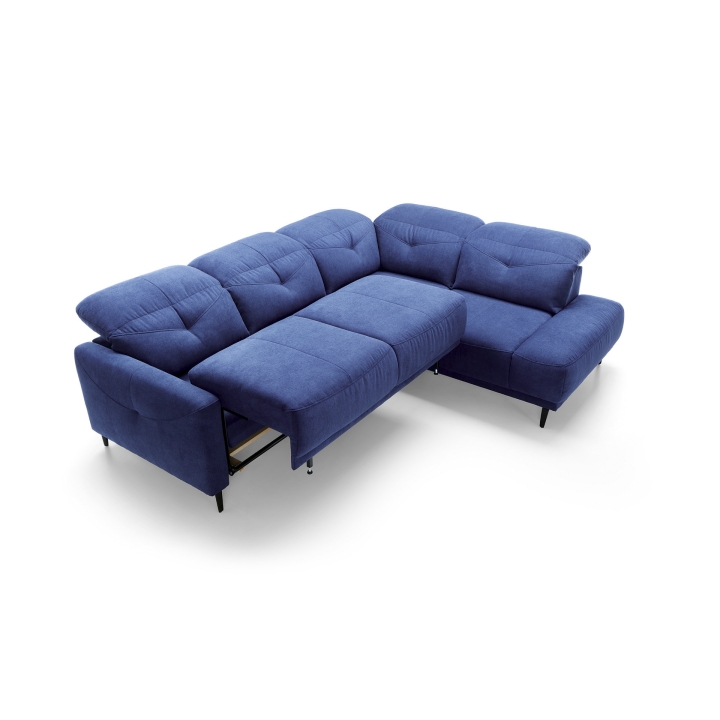 Podczas dziennego relaksu użytkownik może korzystać z regulowanych zagłówków, które umożliwiają dopasowanie oparcia do indywidualnych potrzeb. W godzinach nocnych narożnik zmienia się w wygodne miejsce do spania o powierzchni 120x195 cm, zapewniając odpowiednie podparcie i przestrzeń. Dodatkowo wyposażony został w pojemnik na pościel, który pozwala na bezpieczne i wygodne przechowywanie tekstyliów.