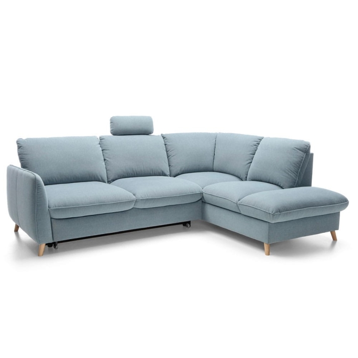 Narożnik wyposażony jest w pojemnik na pościel, umożliwiający przechowywanie koców, poduszek lub innych tekstyliów. Dzięki temu przestrzeń wokół mebla pozostaje uporządkowana, a wszystkie niezbędne akcesoria są zawsze pod ręką. Mechanizm rozkładania został opracowany tak, aby obsługa była płynna i bez wysiłku.