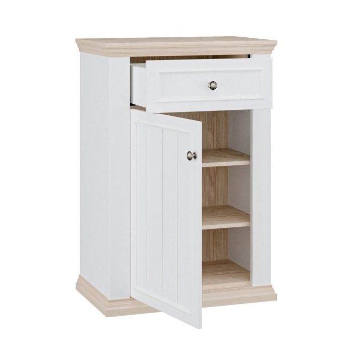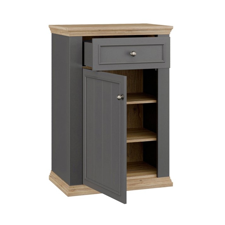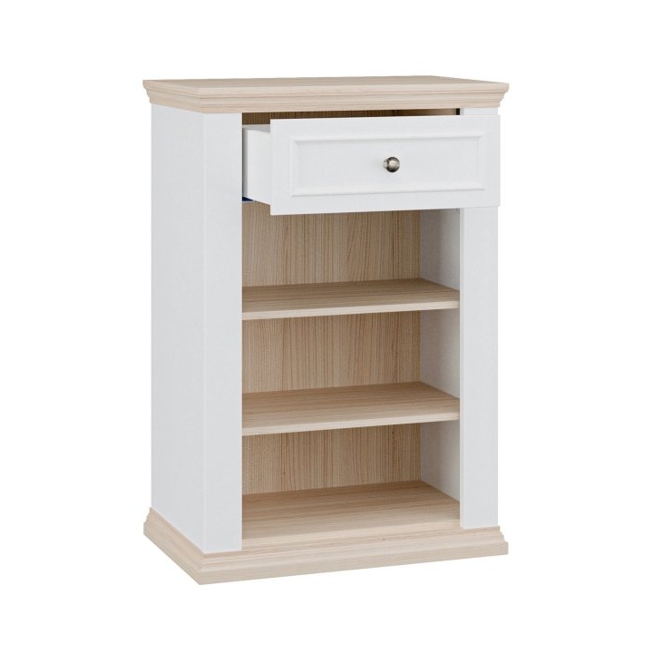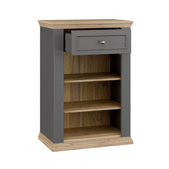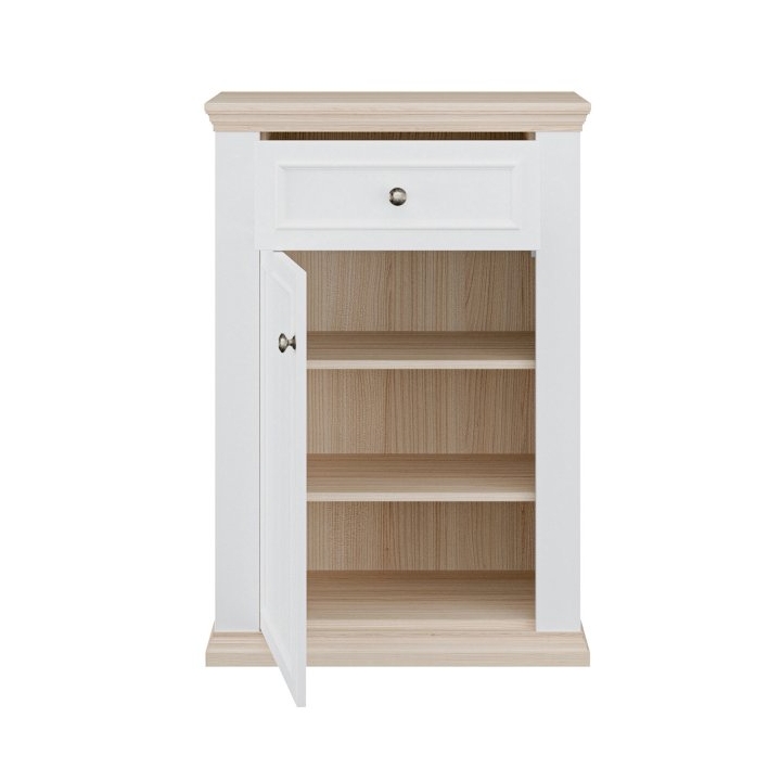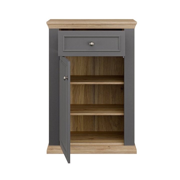 Układ wnętrza szafki pozwala na wygodne przechowywanie obuwia oraz podręcznych akcesoriów. W górnej części znajduje się szuflada, która służy jako schowek na klucze, dokumenty lub inne drobiazgi. Pod nią umieszczono zamykaną szafkę z dwiema półkami, co ułatwia segregację butów lub akcesoriów domowych.