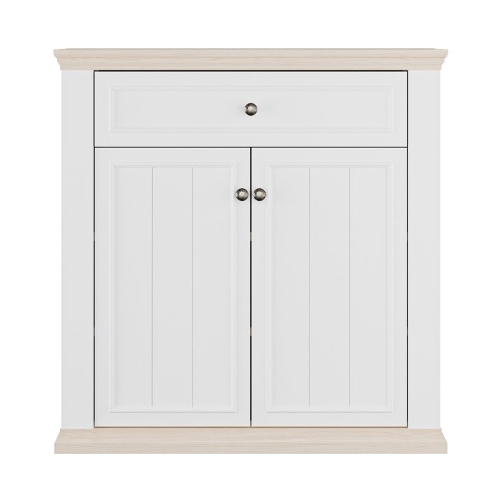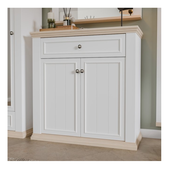 Mebel oferuje dużą przestrzeń do przechowywania obuwia oraz akcesoriów. Główną część stanowi dwudrzwiowa szafka, wewnątrz której znajdują się dwie półki – taki układ pozwala na pomieszczenie około 12 par butów. W górnej sekcji umieszczono szeroką szufladę na klucze, dokumenty lub inne drobiazgi. Zastosowanie prowadnic Quadro Soft Close oraz systemu cichego domyku gwarantuje płynny ruch szuflady i bezgłośne domykanie frontów.