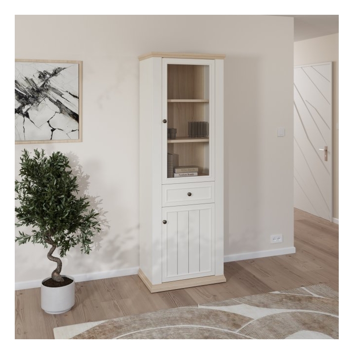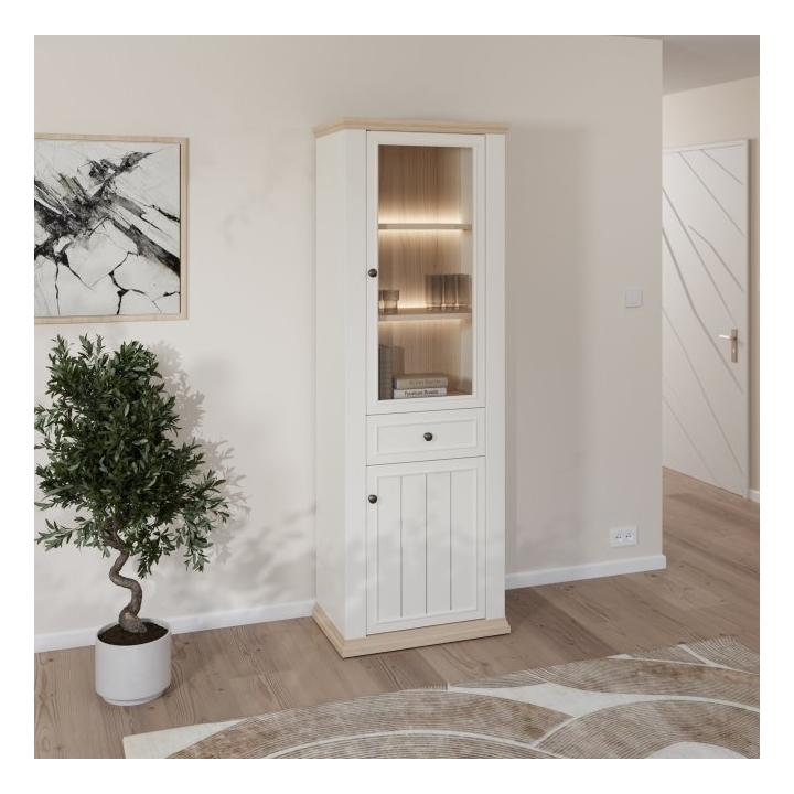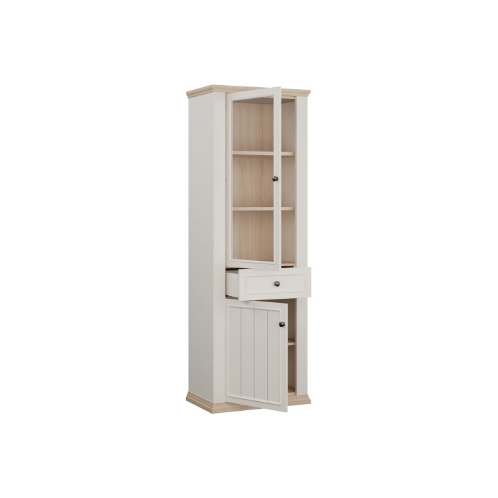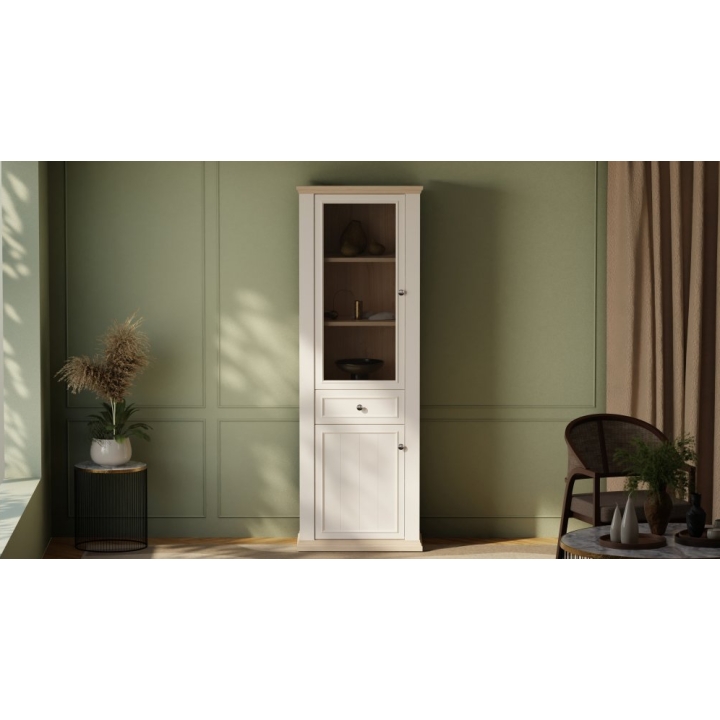 Wnętrze witryny podzielono na trzy sekcje. Górna część to przeszklony front, za którym znajdują się trzy półki idealne do ekspozycji naczyń lub dekoracji. W centralnej części umieszczono szufladę na drobne przedmioty, a dół mebla zamykany jest pełnym frontem, za którym znajduje się jedna obszerna półka. Istnieje możliwość dokupienia opcjonalnego oświetlenia LED, które podkreśli zawartość szklanej części.