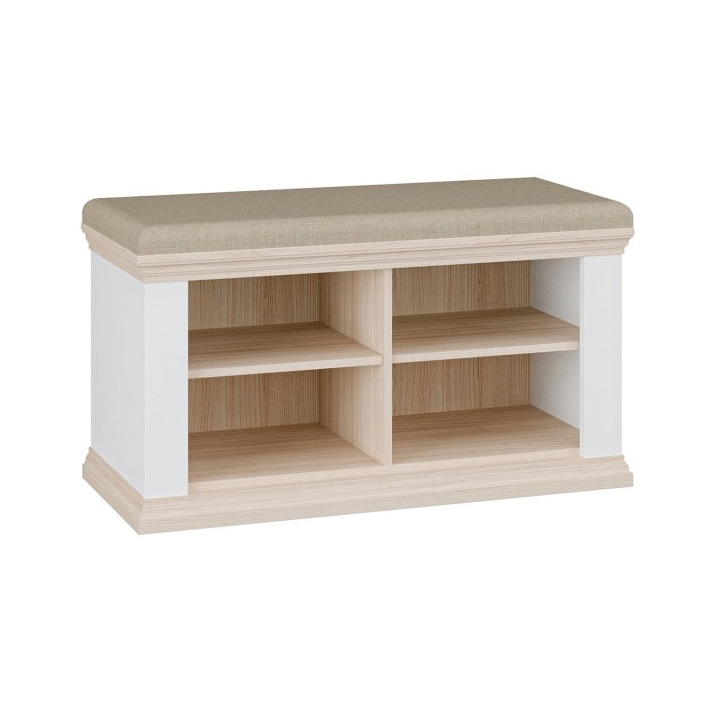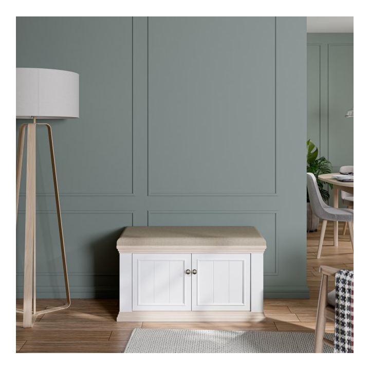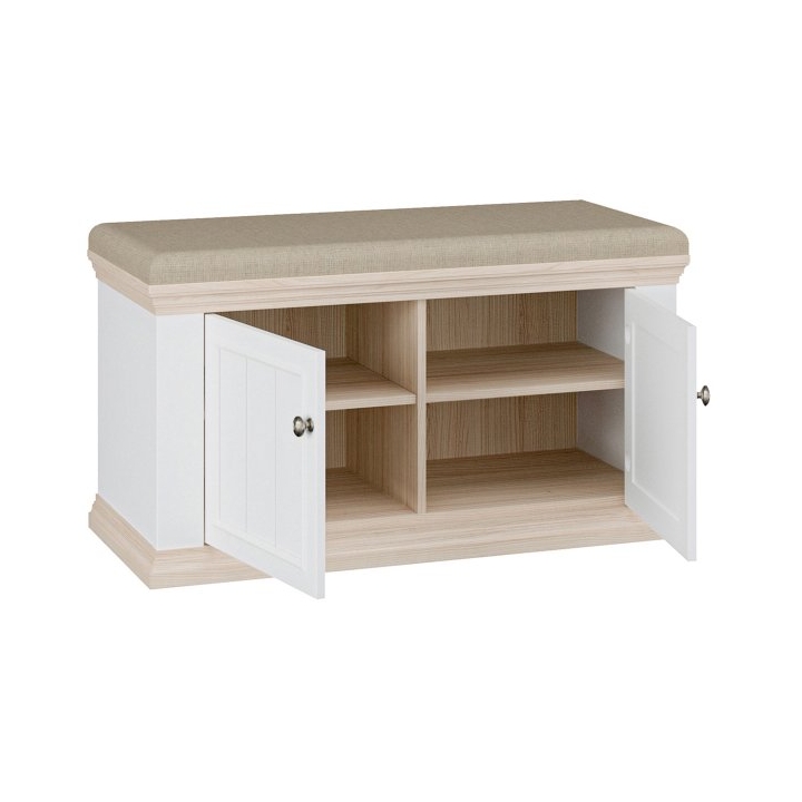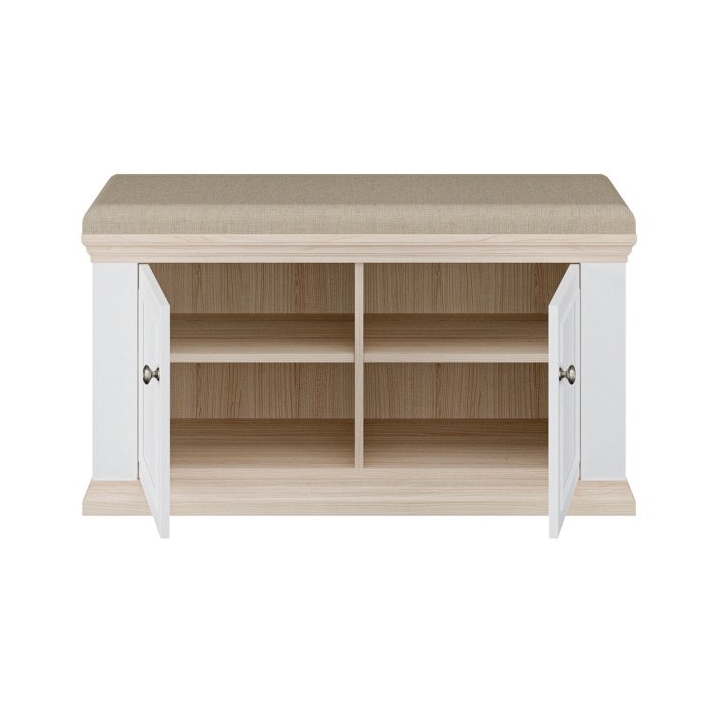 Główną część mebla stanowi dwudrzwiowa szafka, wewnątrz której znajdują się dwie półki, co pozwala na uporządkowanie butów lub akcesoriów domowych. Miękkie, tapicerowane siedzisko zapewnia wygodne miejsce podczas zmiany obuwia.