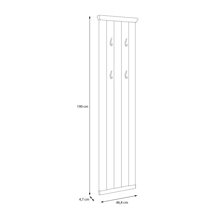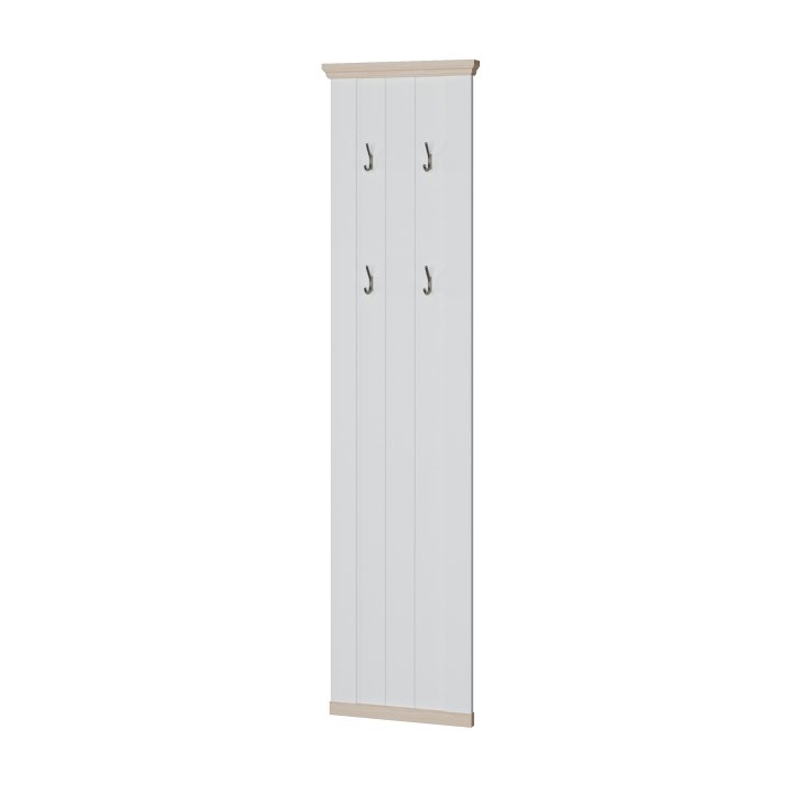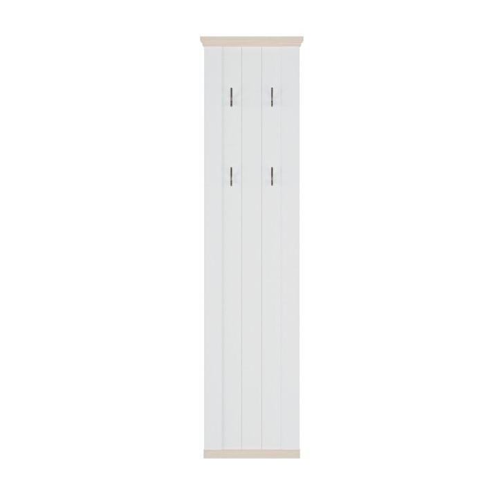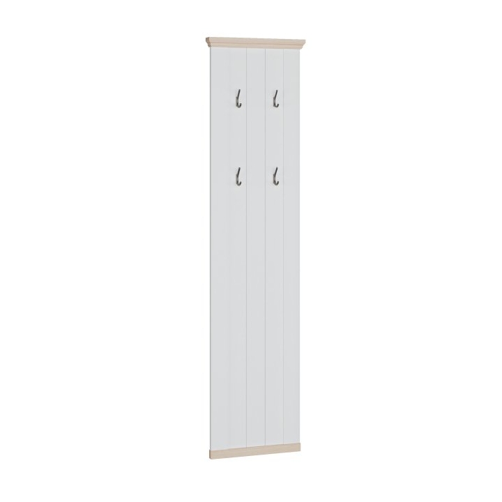 Mebel został wyposażony w cztery metalowe haczyki, które służą do stabilnego zawieszania odzieży wierzchniej, torebek lub kluczy. Pionowy układ optycznie wydłuża pomieszczenie.