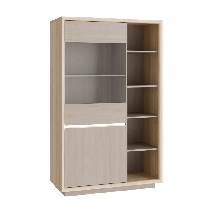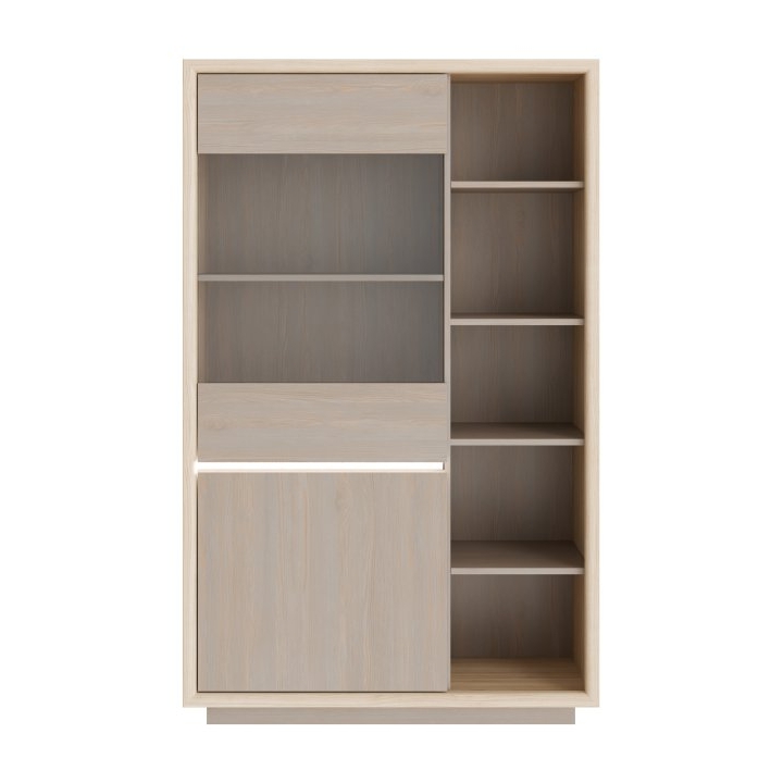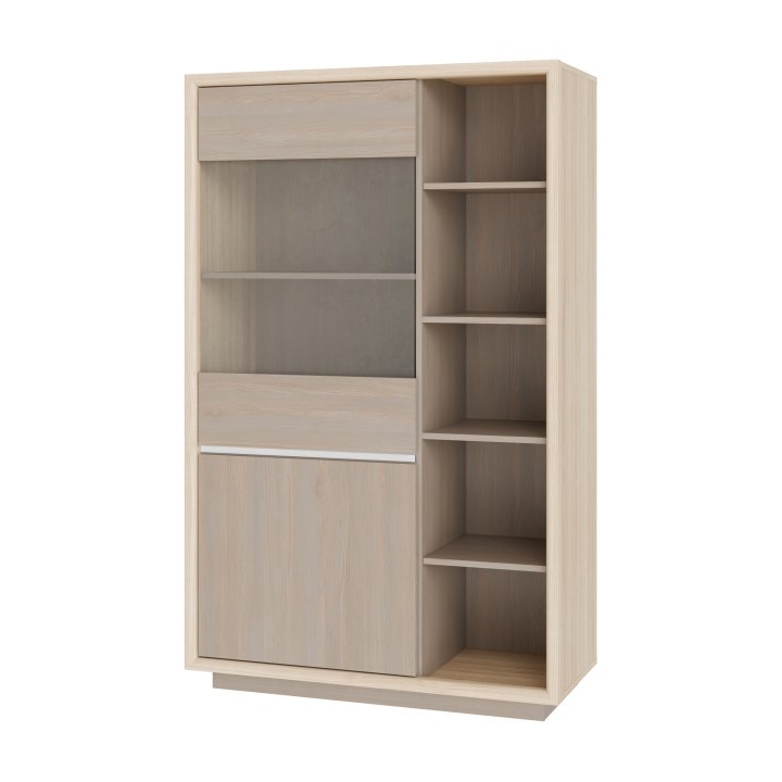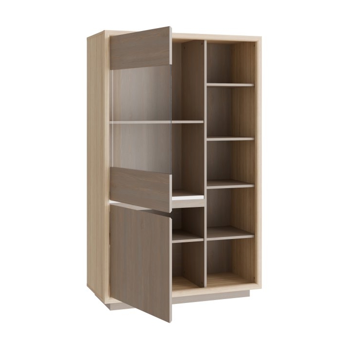 Witryna została wykończona w kontrastowym zestawieniu dekorów Dąb Riva oraz Sosna Imbiah. Górna część frontu posiada przeszklenie z transparentnego szkła hartowanego, które pozwala na bezpieczne eksponowanie książek lub pamiątek, chroniąc je jednocześnie przed kurzem.