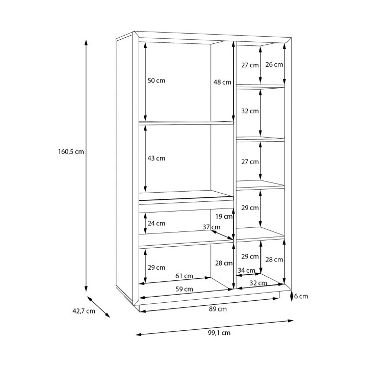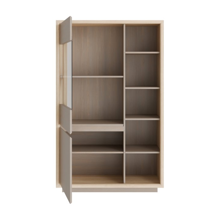 closeWitryna Ficar o szerokości 99 cm, wysokości 160,5 cm oraz głębokości 42,7 cm to dwudrzwiowy mebel o znacznej pojemności, który łączy funkcję ekspozycyjną z przechowywaniem.