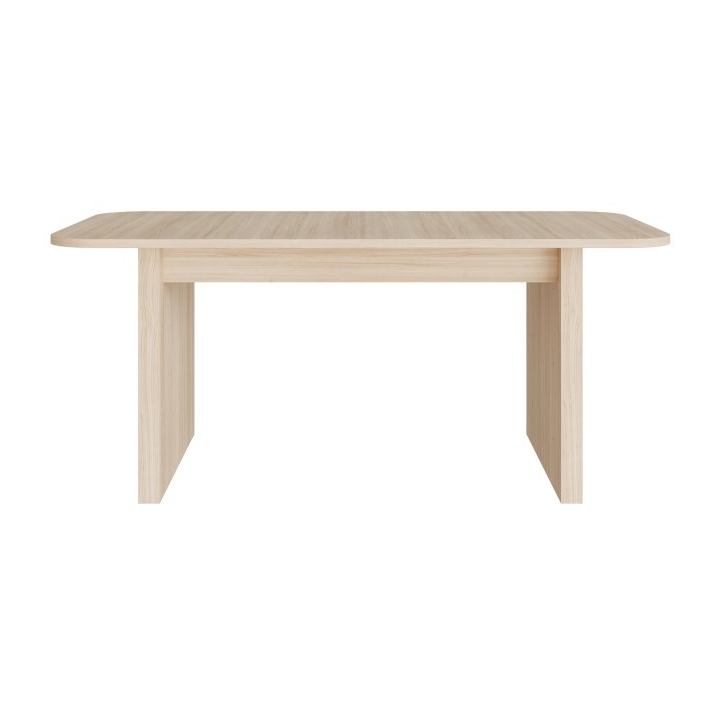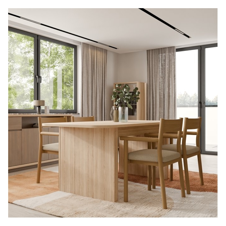 Zastosowane materiały charakteryzują się odpornością na codzienne użytkowanie, a gładka powierzchnia ułatwia utrzymanie czystości po zakończonych posiłkach. Jasny dekor dębowy o naturalnym rysunku drewna sprawia, że mebel optycznie rozjaśnia pomieszczenie.