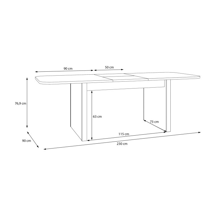 Wewnętrzna wkładka umieszczona pod blatem pozwala na wydłużenie powierzchni blatu do 230 cm. Dzięki temu rozwiązaniu przy stół zapewnia wygodne miejsce nawet dla 8 osób, co sprawdza się podczas większych uroczystości rodzinnych lub wizyt gości. Solidna konstrukcja blatu pozwala na jego obciążenie do 60 kg, co gwarantuje bezpieczeństwo podczas serwowania ciężkich naczyń oraz dekoracji ustawionych na środku mebla.