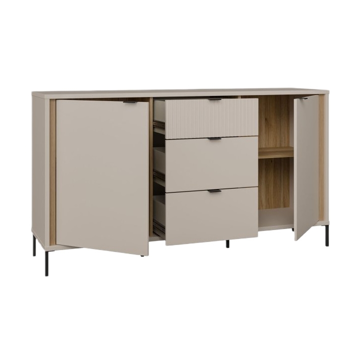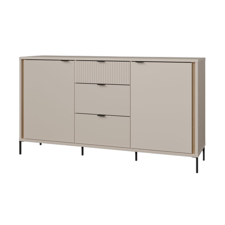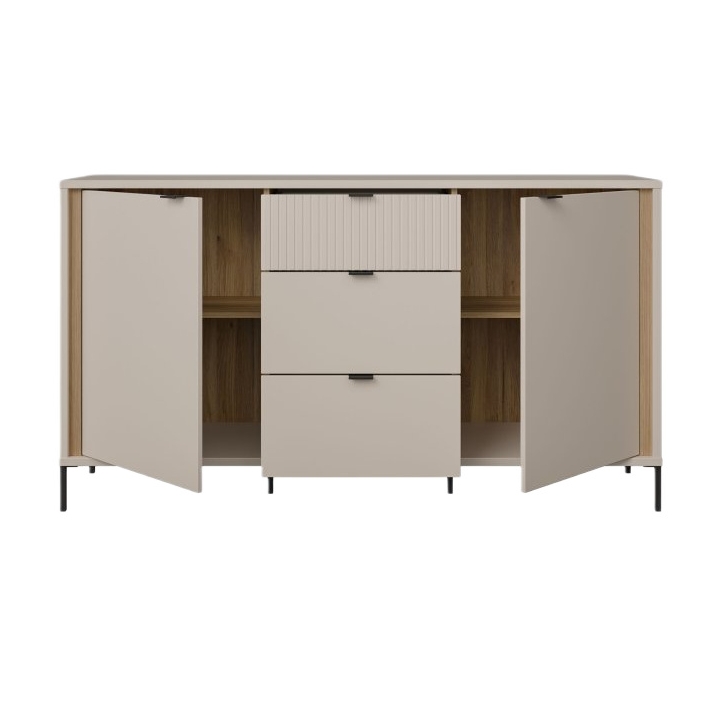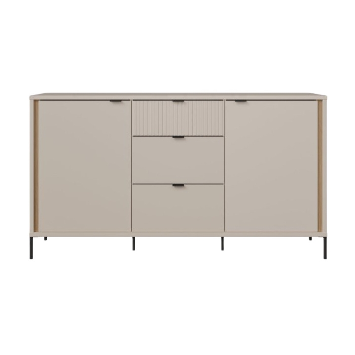 closeKomoda Seravel o szerokości 158,8 cm, wysokości 87,2 cm oraz głębokości 41,5 cm łączy kaszmirowe fronty z korpusem w odcieniu dębu mauvella. Mebel osadzono na wysokich, czarnych nóżkach, które kontrastują z jasną kolorystyką płyty. Całość uzupełniają czarne, metalowe uchwyty, dopasowane kolorystycznie do podstawy, co podkreśla nowoczesną formę mebla.
