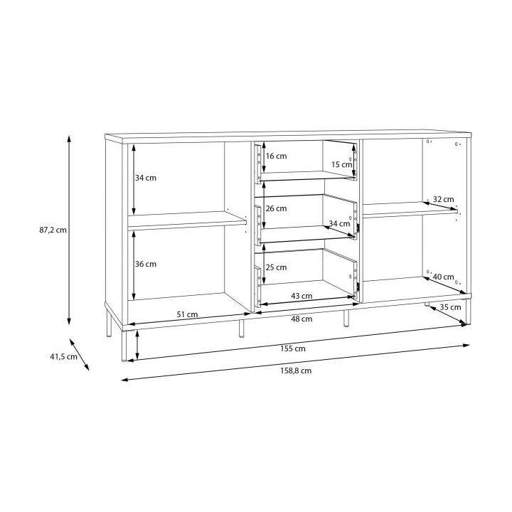 W centralnej części znajdują się trzy pojemne szuflady o maksymalnym obciążeniu do 5 kg każda. Po bokach umieszczono dwie szafki wyposażone w półki, które wytrzymują ciężar do 15 kg, co pozwala na rozmieszczenie przedmiotów o różnych gabarytach. Szeroki blat stanowi miejsce na ekspozycję dekoracji, a uniwersalna kolorystyka pozwala na dopasowanie komody do zmieniającego się wystroju pomieszczenia.