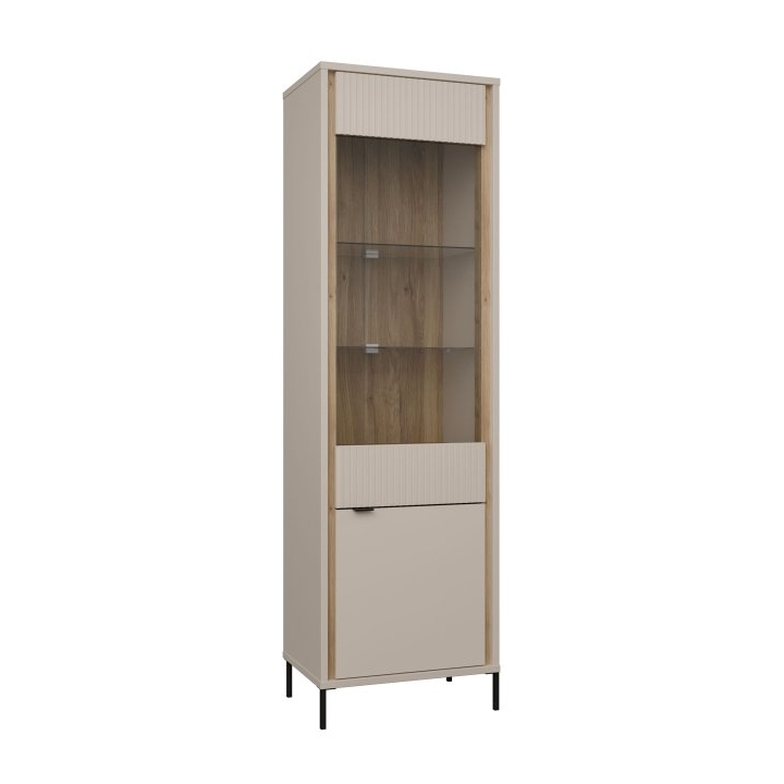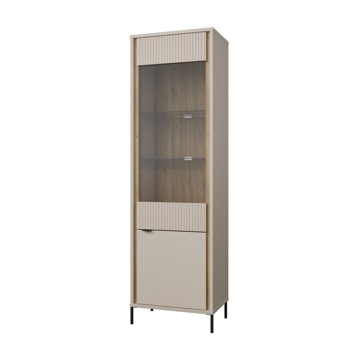 closeWitryna Seravel o szerokości 59,4 cm, wysokości 199,2 cm oraz głębokości 41,5 cm charakteryzuje się połączeniem kaszmirowych frontów z korpusem w ciepłym odcieniu dębu mauvella.