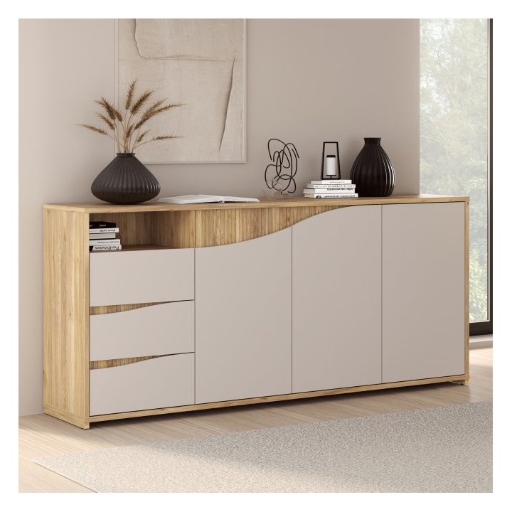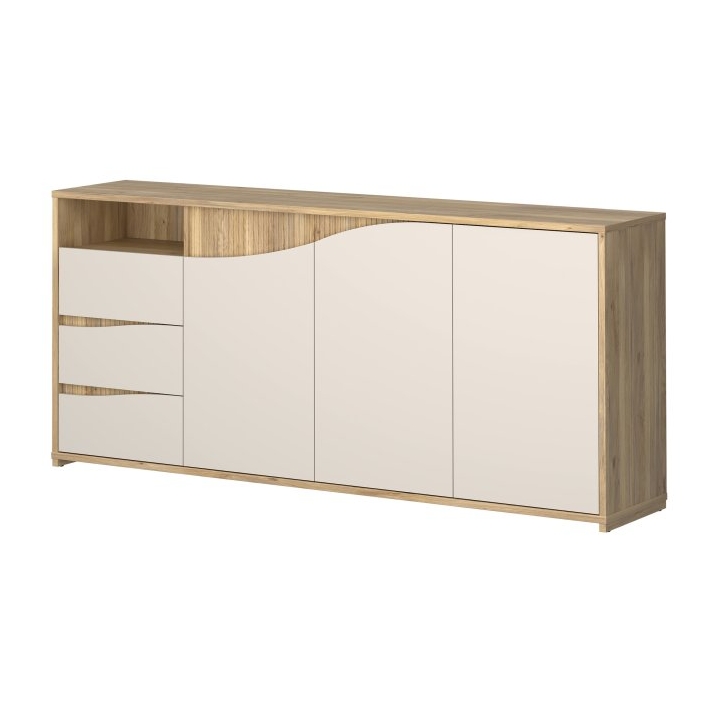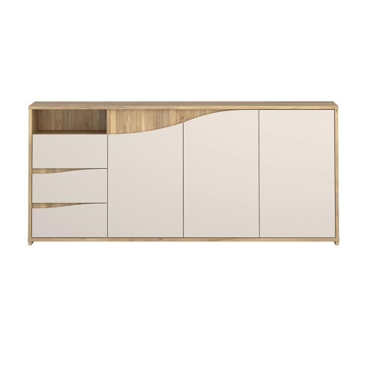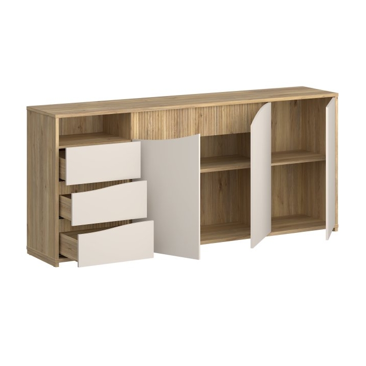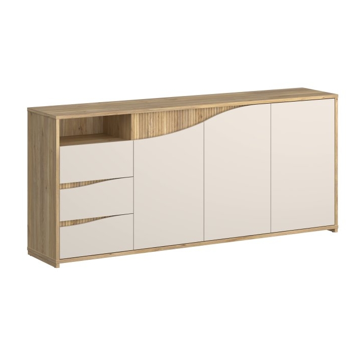 closeKomoda Poem o szerokości 203,9 cm, wysokości 91 cm oraz głębokości 42 cm bazuje na zestawieniu ciepłego odcienia dębu mauvella z frontami w kolorze kaszmiru. Charakterystycznym elementem jest unikalny wzór frontów, gdzie pionowe ryflowania w odcieniu drewna płynnie łączą się z jasną, gładką płytą. Taka kolorystyka rozświetla pomieszczenie i pozwala na swobodne dopasowanie mebla do różnych stylów wykończenia wnętrza.