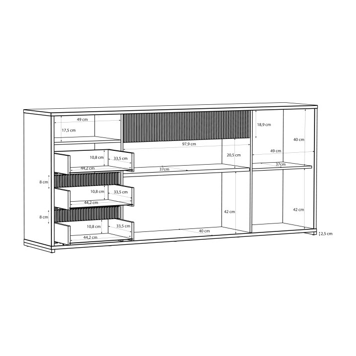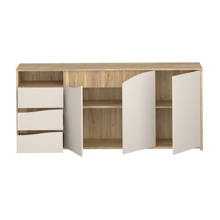 Wnętrze komody oferuje zróżnicowane formy przechowywania, w tym dwie szafki, z których każda skrywa pojemną półkę na większe przedmioty. Obok umieszczono trzy szuflady wyposażone w system cichego domyku oraz dodatkową otwartą wnękę na rzeczy potrzebne pod ręką. Szeroki blat o maksymalnym obciążeniu do 40 kg stanowi stabilną podstawę dla domowych dekoracji, natomiast szuflady wytrzymują ciężar do 5 kg każda.
