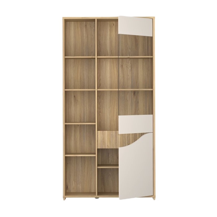 Wnętrze mebla tworzy układ licznych półek, z których dwie posiadają opcję regulacji wysokości, co umożliwia swobodne rozmieszczenie przedmiotów o różnych gabarytach. Otwarte wnęki stanowią miejsce na książki lub pamiątki, a zamykane sekcje pozwalają na uporządkowanie domowych drobiazgów.