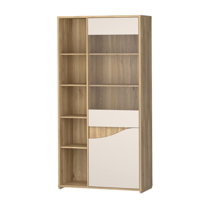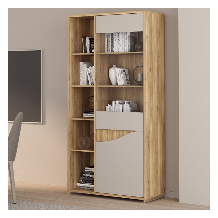 Witryna Poem o szerokości 99,5 cm, wysokości 196,6 cm oraz głębokości 42 cm bazuje na dominującym odcieniu dębu mauvella, który zestawiono z frontami posiadającymi kaszmirowe akcenty. Naturalna kolorystyka wprowadza do pomieszczenia spokojną atmosferę, pozwalając na łatwe dopasowanie mebla do pozostałych elementów wyposażenia pokoju dziennego.