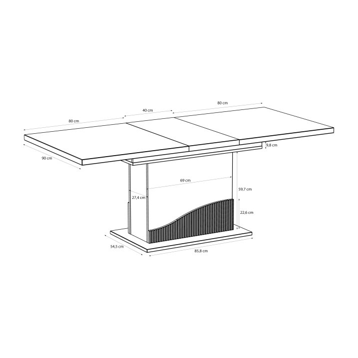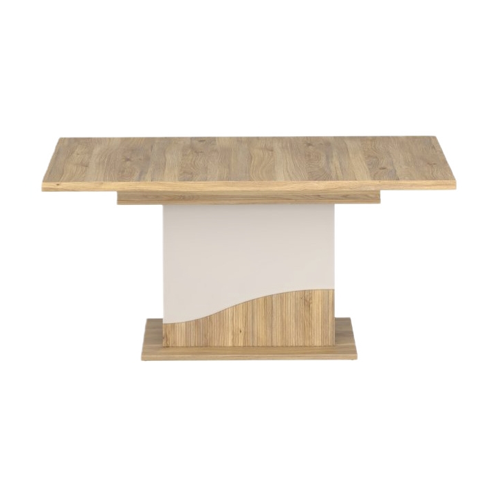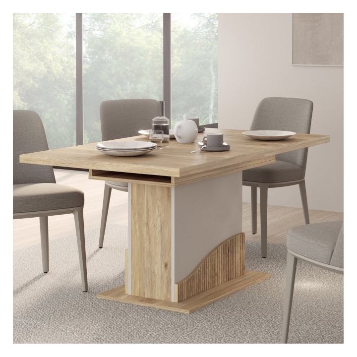 Konstrukcja posiada wewnętrzną wkładkę, która umożliwia zwiększenie szerokości blatu do 200 cm, co pozwala na wygodne ugoszczenie do 8 osób. Wybrane elementy mebla zostały zabezpieczone obrzeżem ABS, co zwiększa odporność na przypadkowe uderzenia i codzienne użytkowanie.