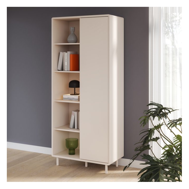 closeRegał Playly o szerokości 84,4 cm, wysokości 192,6 cm oraz głębokości 42 cm to minimalistyczna propozycja w jednolitej, kaszmirowej kolorystyce. Mebel osadzono na wysokich nóżkach, które dodają konstrukcji lekkości i ułatwiają zachowanie porządku pod spodem. Brak uchwytów oraz gładka powierzchnia frontów tworzą nowoczesną formę, która wpisuje się w różnorodne aranżacje wnętrz.