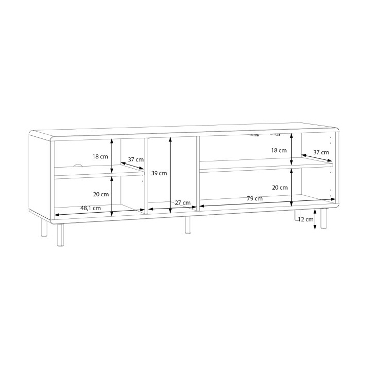 Mebel stanowi bazę pod telewizor o wielkości do 64 cali, oferując jednocześnie zróżnicowane miejsce do przechowywania. Do dyspozycji pozostaje otwarta półka na dekoder, dodatkowa pionowa wnęka na akcesoria oraz zamykana szafka z wewnętrzną półką na przedmioty, które mają pozostać niewidoczne. W tylnej ścianie umieszczono otwory na kable, które pozwalają na zachowanie porządku wśród podłączonych urządzeń.
