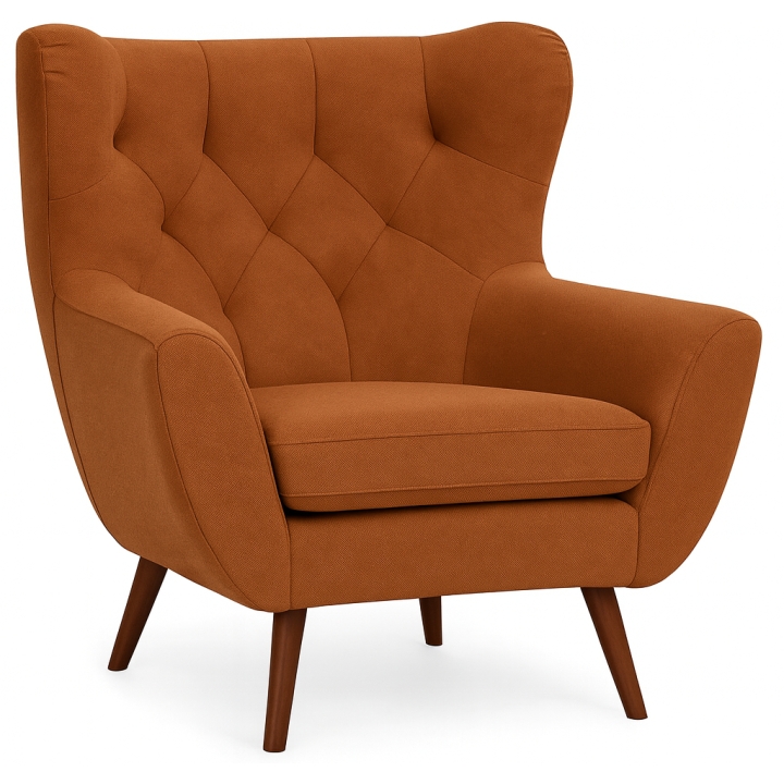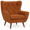 Model opiera się na drewnianych nóżkach o wysokości 18 cm, wybarwionych w odcieniu Dąb Wosk Brąz, co nadaje bryle lekkości oraz ułatwia utrzymanie porządku w przestrzeni pod siedziskiem. Solidna podstawa gwarantuje stabilność i trwałość konstrukcji, dzięki czemu fotel zachowuje swoje walory estetyczne przez długie lata. Całość tworzy spójną, dopracowaną formę, która wpasowuje się w różnorodne aranżacje wnętrz.