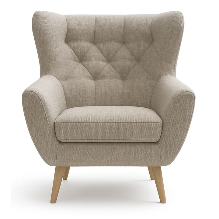 Model został osadzony na drewnianych nóżkach o wysokości 18 cm, wybarwionych w odcieniu Dąb Wosk, które dodają bryle lekkości i umożliwiają łatwe utrzymanie porządku pod meblem. Solidna podstawa gwarantuje trwałość oraz stabilność, dzięki czemu fotel zachowuje swoje walory wizualne przez długi czas. Wysoka jakość wykonania przekłada się na długotrwałą satysfakcję z użytkowania.